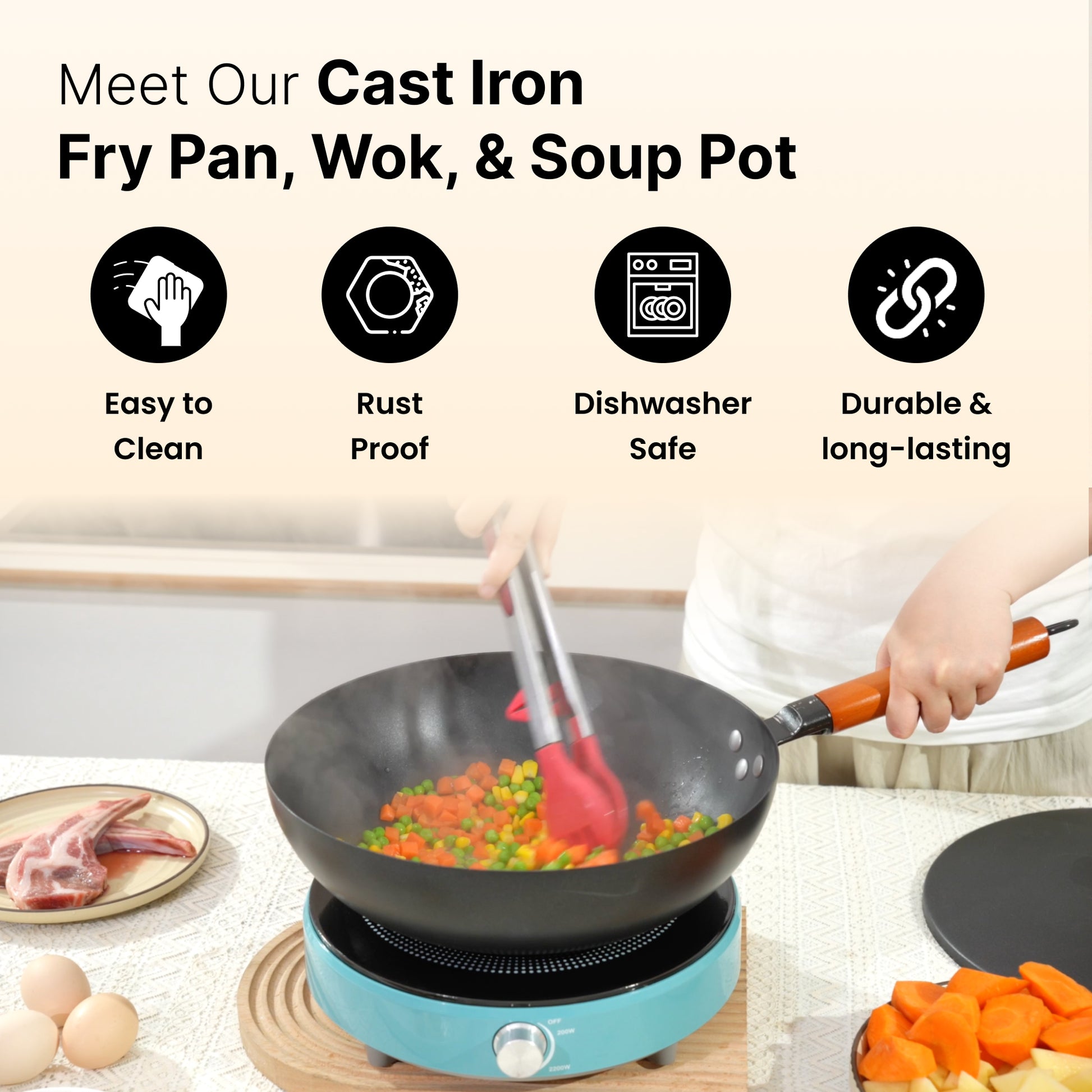 UMAI Cast Iron Pots and Pans Cookware with Wooden Handle | Cast Iron Fry Pan (26cm) | Wok & Handi (4.4L Each with Lid) | Non Stick Cookware Set | Gas & Induction Pan | Kitchen Set for Home (Black)