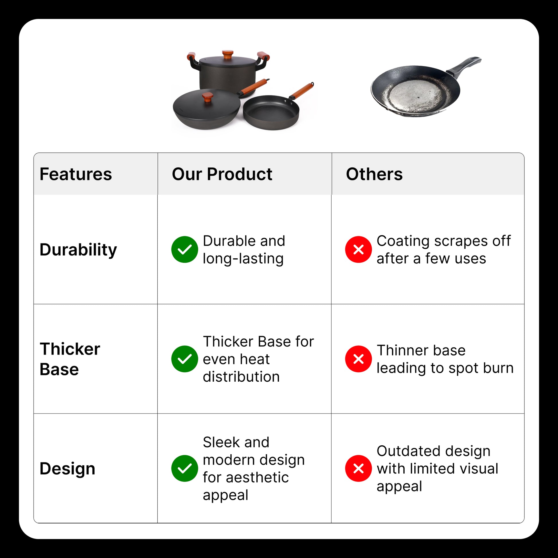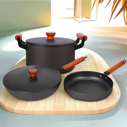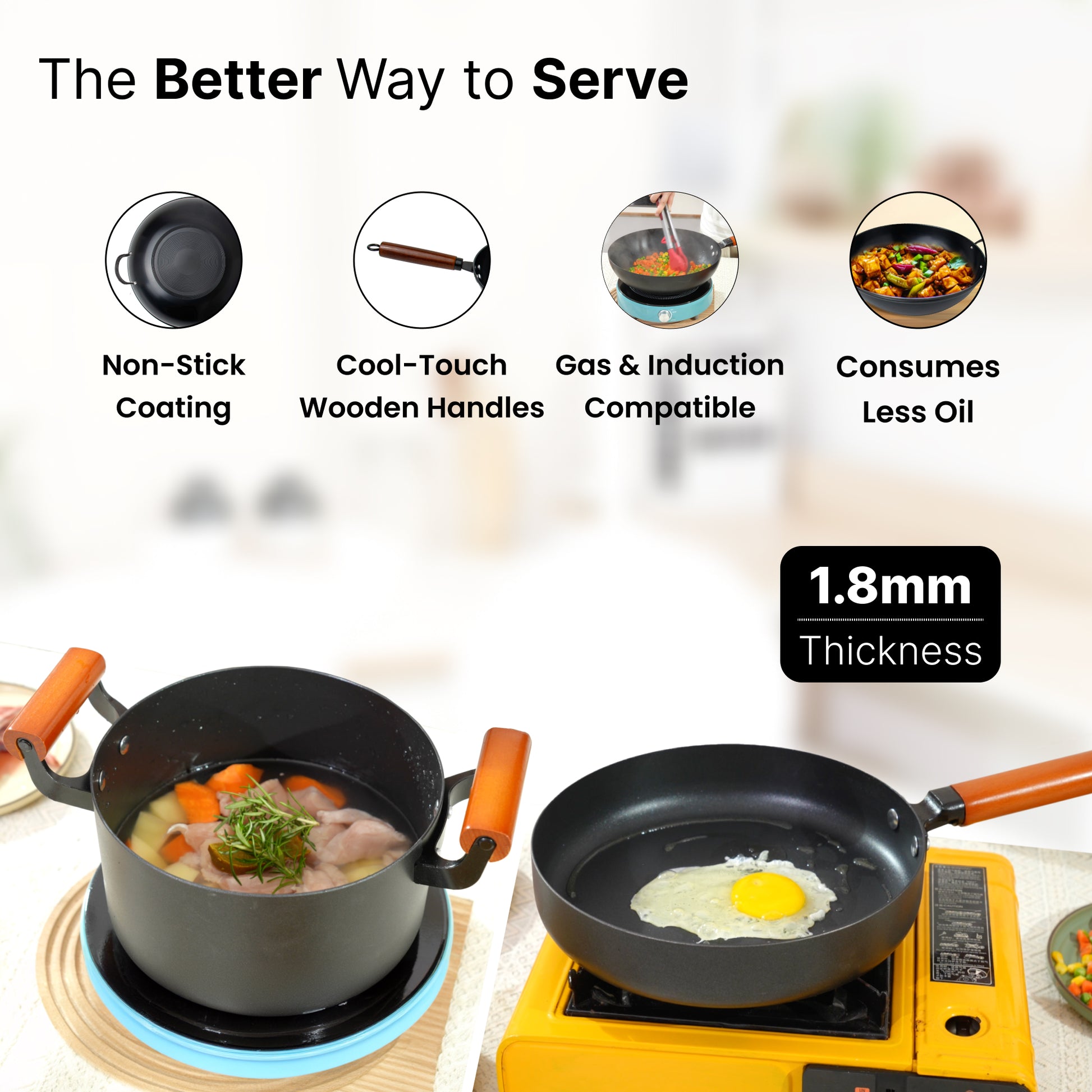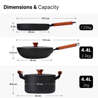 • Complete Set: Includes a fry pan (26cm), wok with lid (4.4L), and a handi/soup pot with lid (4.4L).