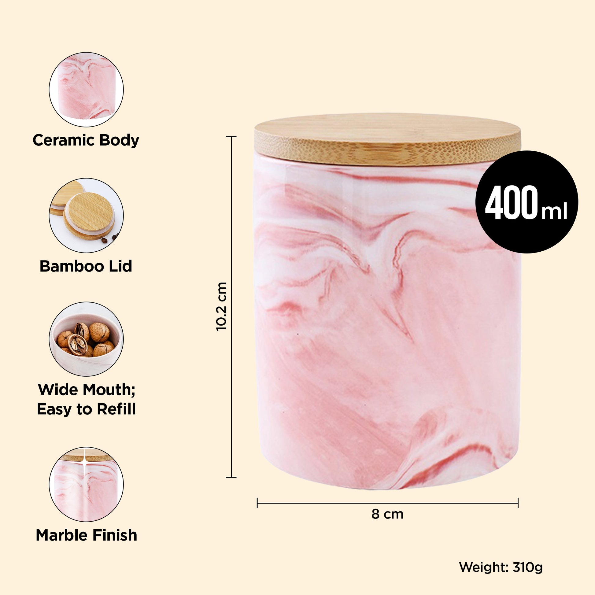 UMAI Ceramic Jar with Bamboo Lid - 400ml| Air-tight Containers for Kitchen Storage | Multipurpose kitchen storage container for Snacks, Tea, Sugar | Pink