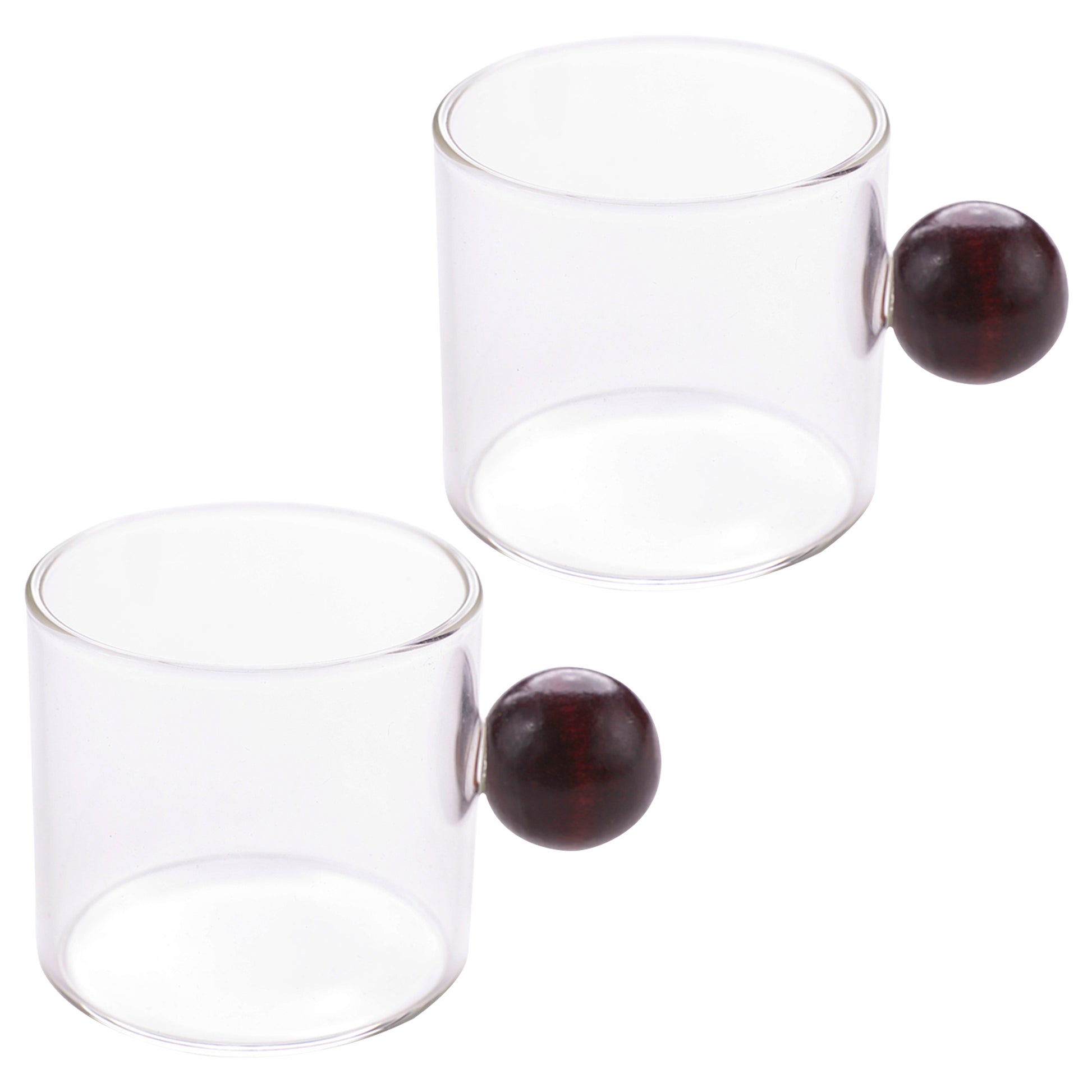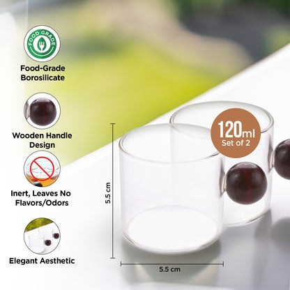 Combo: Borosilicate Glass Coffee Mugs with Wooden Handle - 120ml Each | Stylish, Heat Resistant | Set of 2 | Transparent