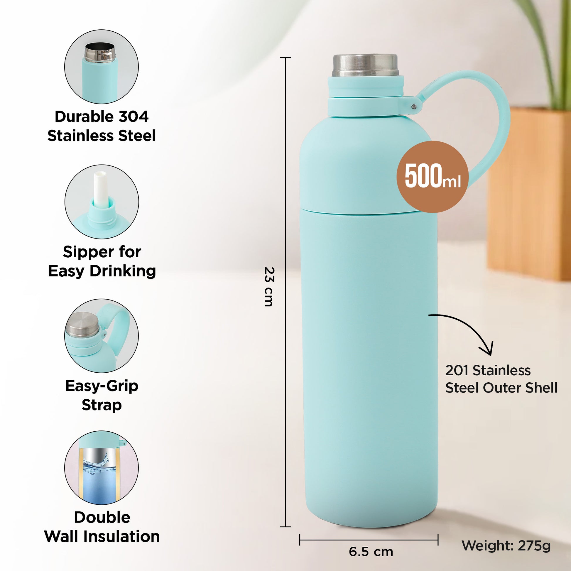 • VERSATILE USAGE FOR ALL OCCASIONS: Whether at home, in the office, at the gym, or during travel, this 500ml bottle is your ideal companion for hydration anywhere.