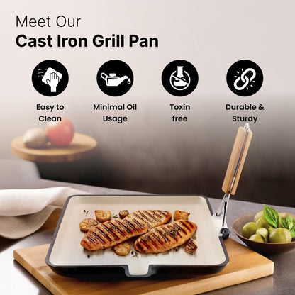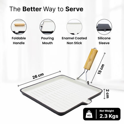 UMAI Enamel Coated Grill Pan Cast Iron with Silicone Sleeve (26cm) | Cast Iron Cookware with Foldable Handle | Rust Proof Cast Iron Skillet | Gas Grill Tawa | Iron Egg/Fish/Fry Pan | Gas & Induction