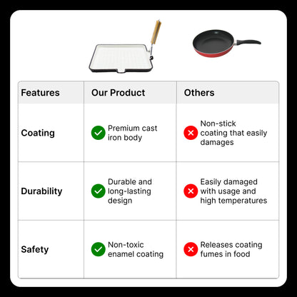 Perfect for grilling favorites like tikka, kebabs, skewers, and barbeque, the durable cast iron construction guarantees exceptional quality that lasts. Unlike flimsy alternatives, this grill pan is rust-proof and easy to clean, making it a practical addition to your kitchen arsenal. Compatible with gas stoves and induction cooktops, this versatile pan expands your cooking possibilities, letting you also roast vegetables or sear juicy meats with ease.