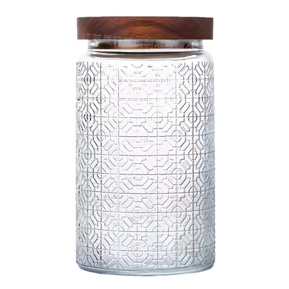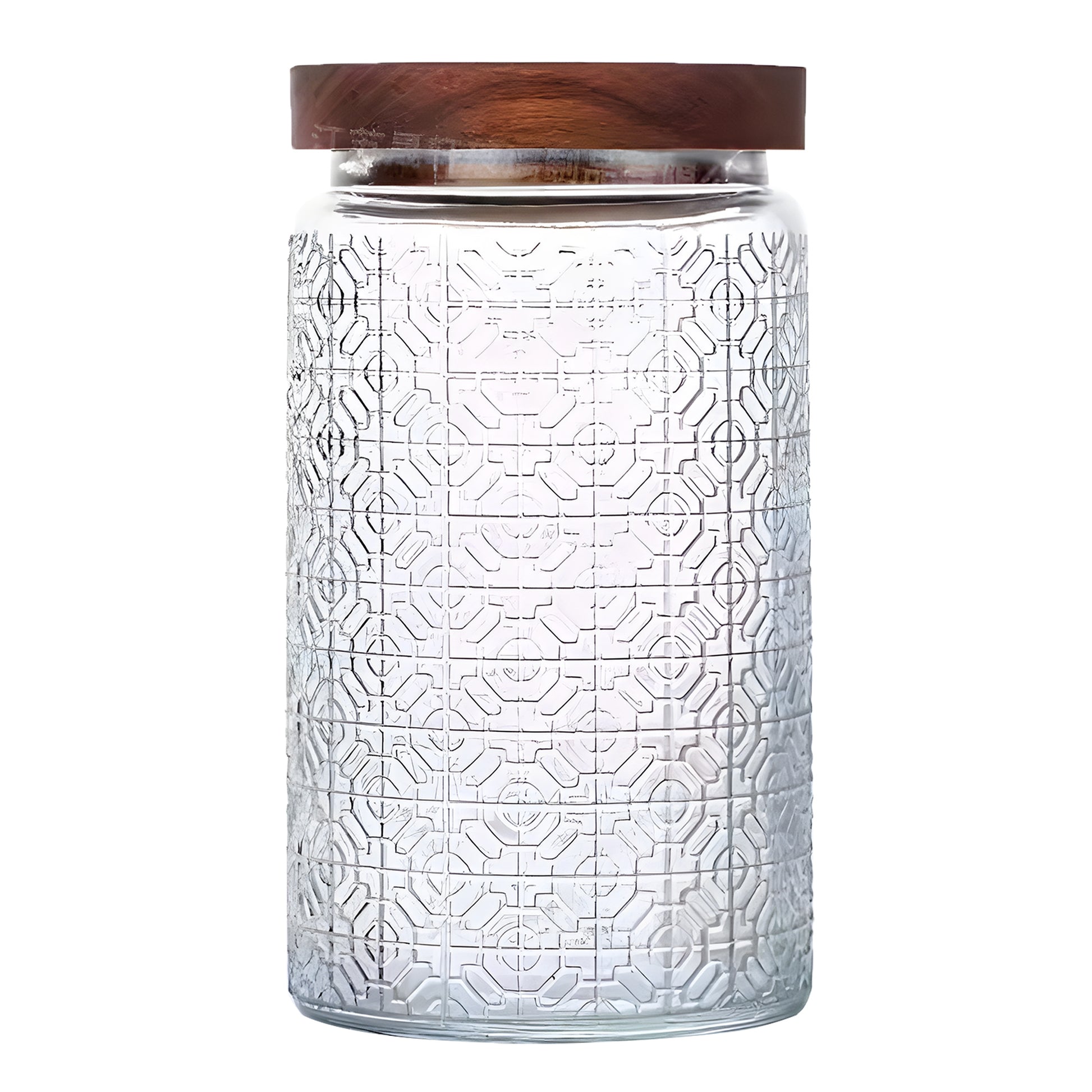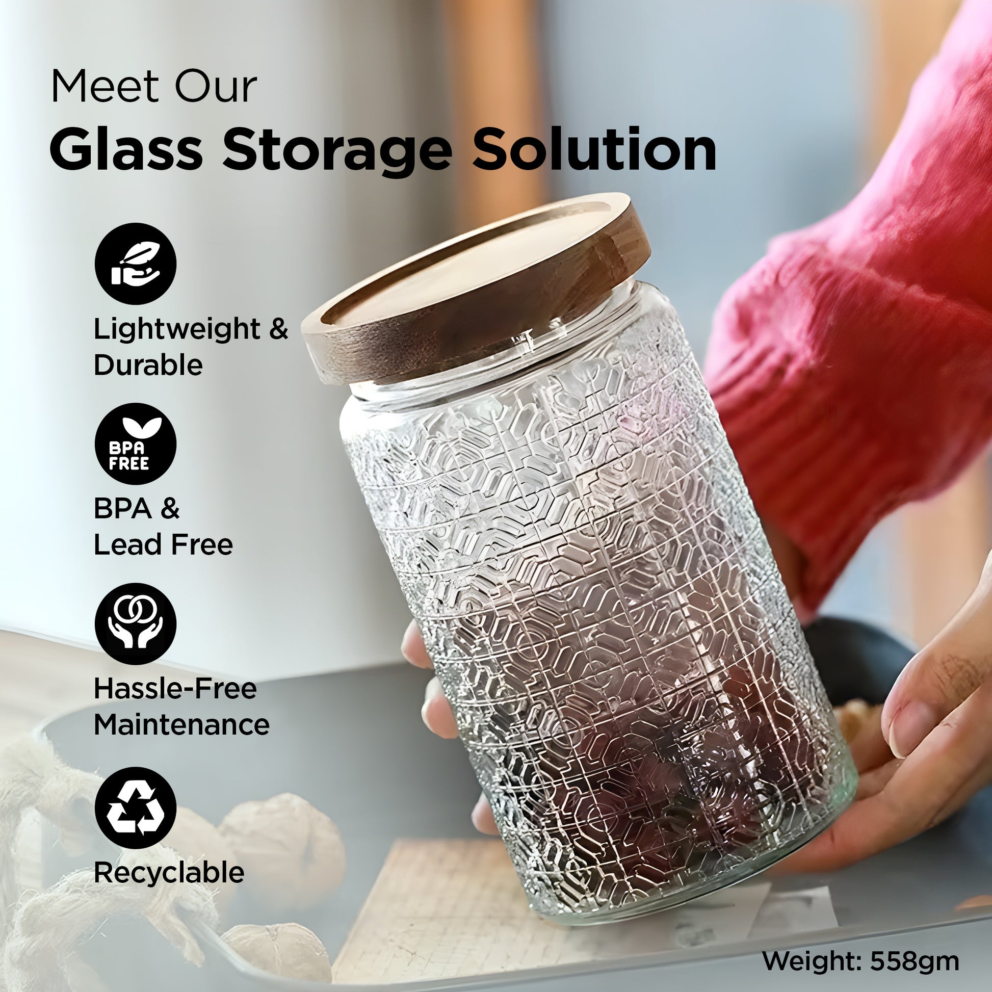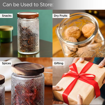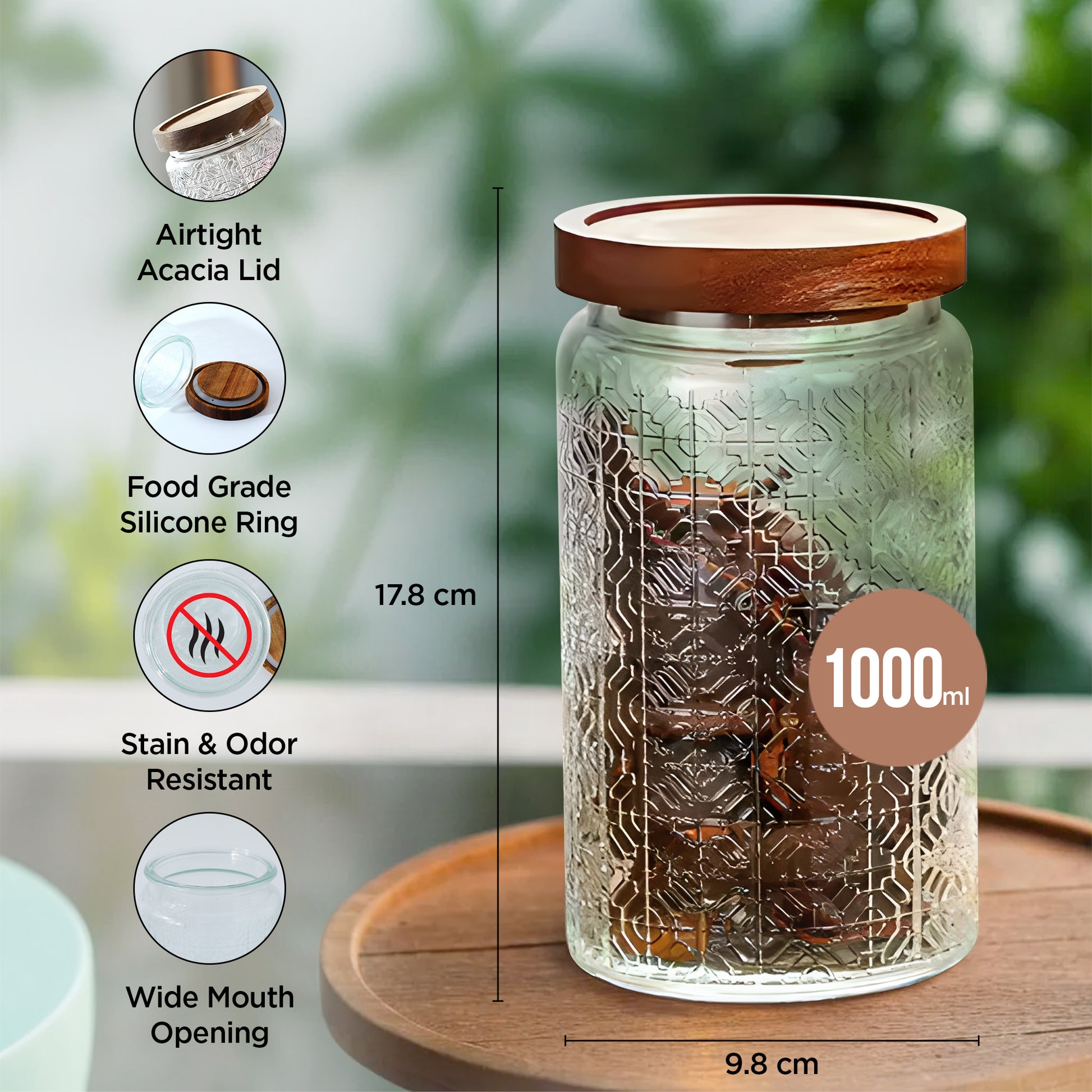 UMAI Glass Jar With Wooden Lid | Airtight Kitchen Containers For Storage | Textured Glass Jars for Kitchen (1000ml)