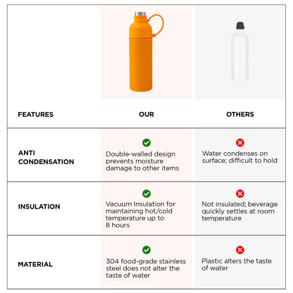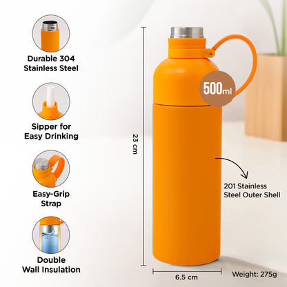 Insulated Double Walled Stainless Steel Water Bottle - Hot & Cold, Leakproof, BPA Free | 500ml | Orange