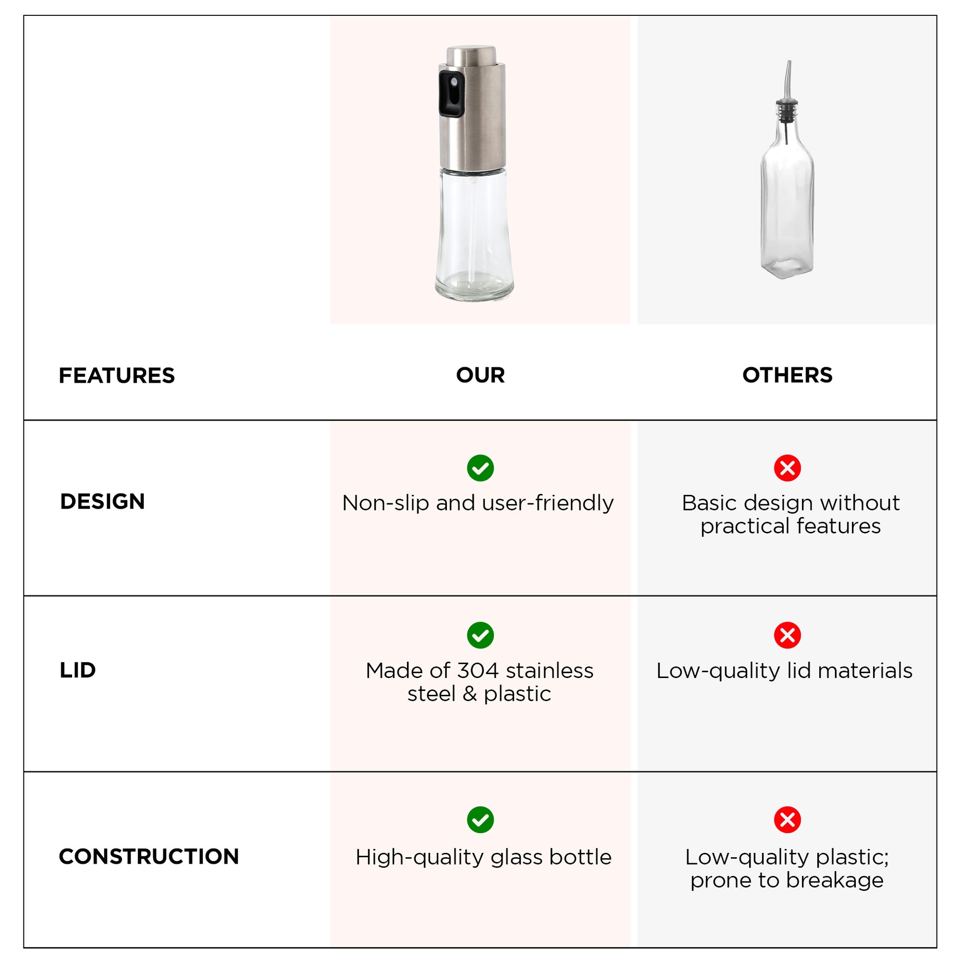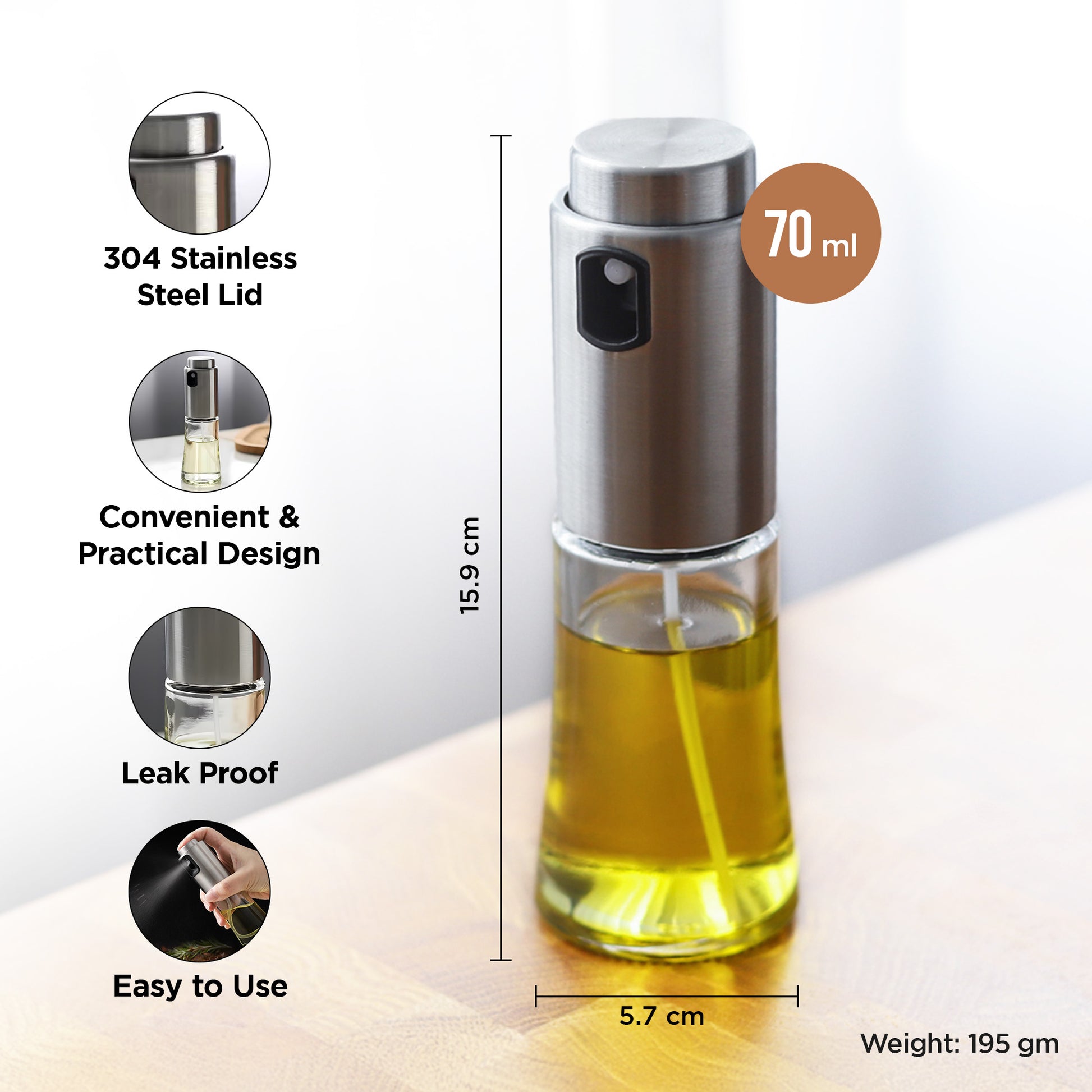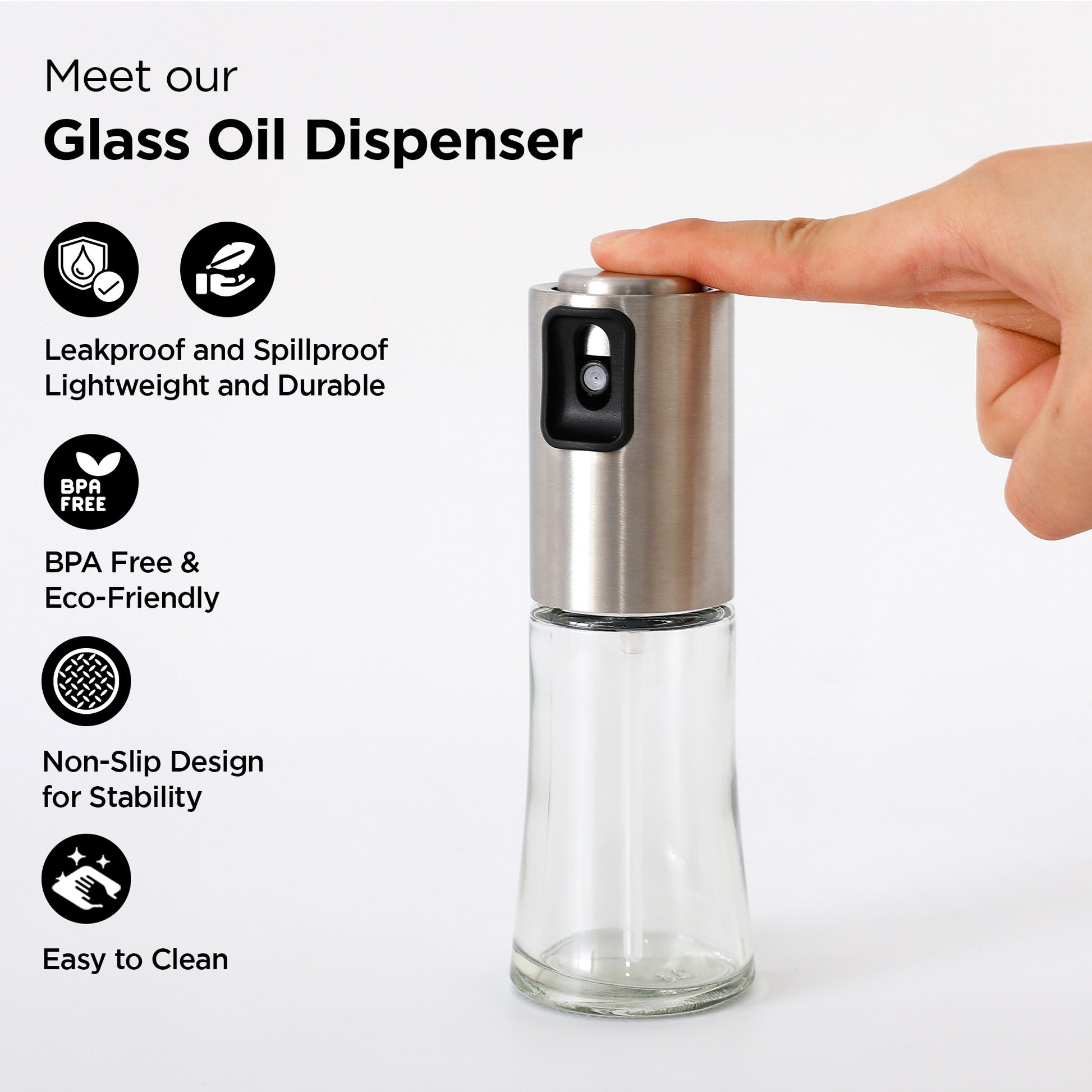 - PRECISE & EASY: Effortless oil dispensing with a non-slip sprayer makes cooking simpler and more stylish.