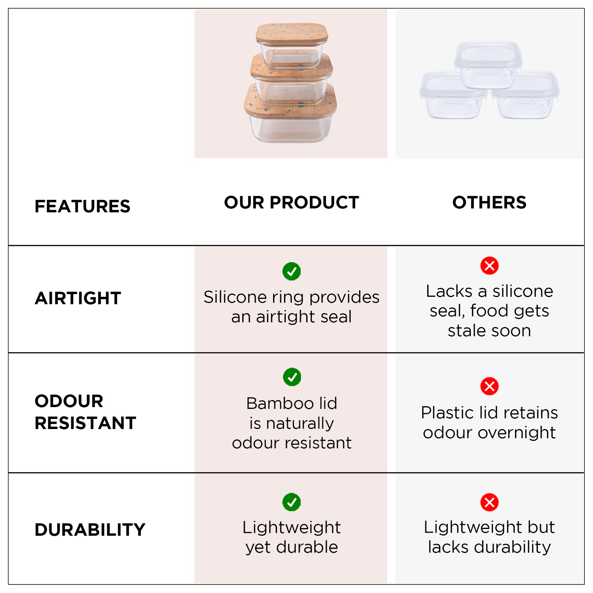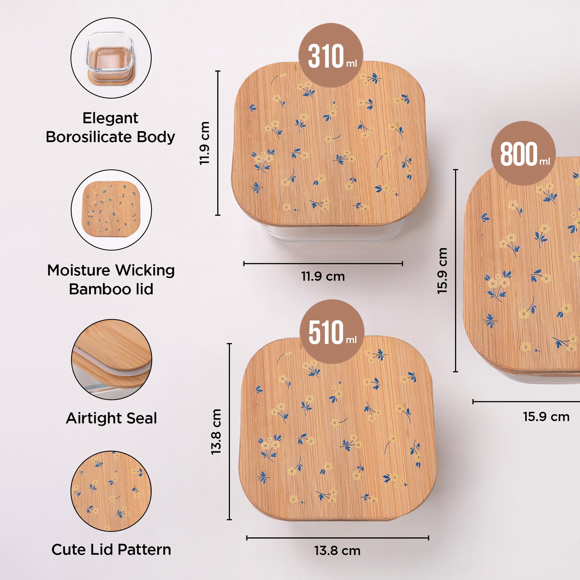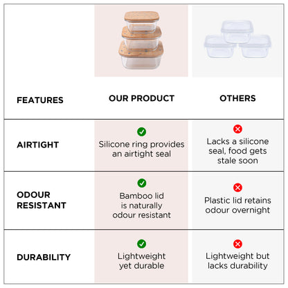 • Improved Lid & Seal: Enjoy the confidence of airtight storage with enhanced bamboo lids and food-grade silicone rings that ensure a secure fit, eliminating any concerns of spills or poor seals.