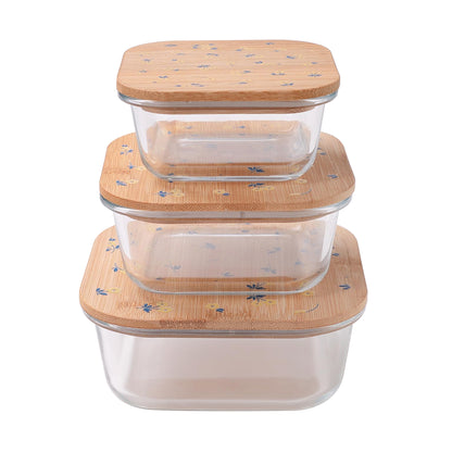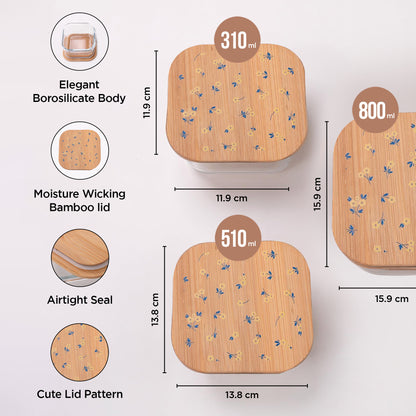 UMAI Pack of 3 Borosilicate Glass Kitchen Containers with Bamboo Lid | 310ml 510ml 800ml | Airtight Square Fridge Storage Boxes | Storage Glass Jars for Cereal, Dry Fruits | Happy Dance Print