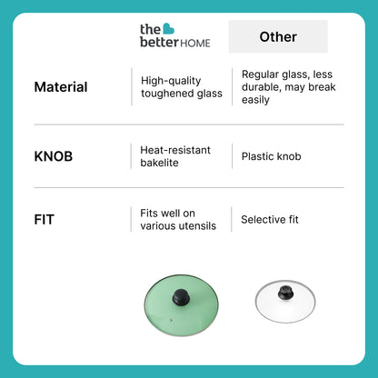 Introducing the 22 cm Universal Glass Lid by The Better Home, your essential kitchen companion designed for enhanced efficiency and spectacular results. Crafted from high-quality toughened glass with a sturdy stainless steel rim, this green glass lid seamlessly blends both functionality and style. It's perfect for covering a range of utensils, whether you're cooking on the stovetop or storing food in the fridge.