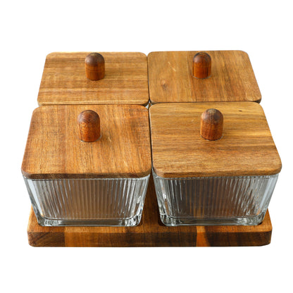 UMAI Serving Set: Wooden Tray with 4 Glass Jars (220ml each) | Transparent | Ideal for Snacks