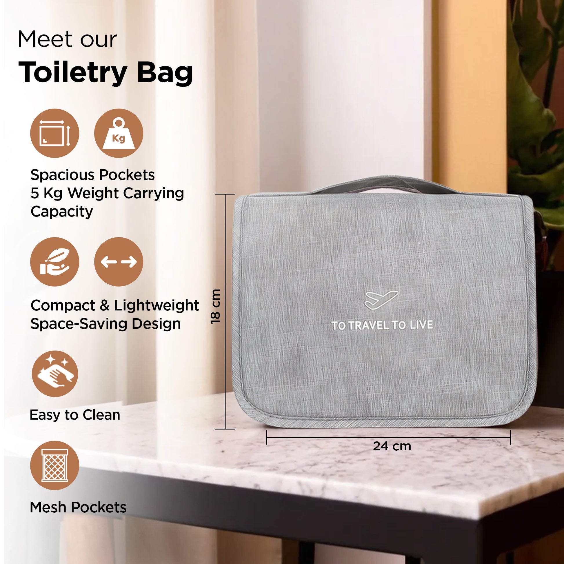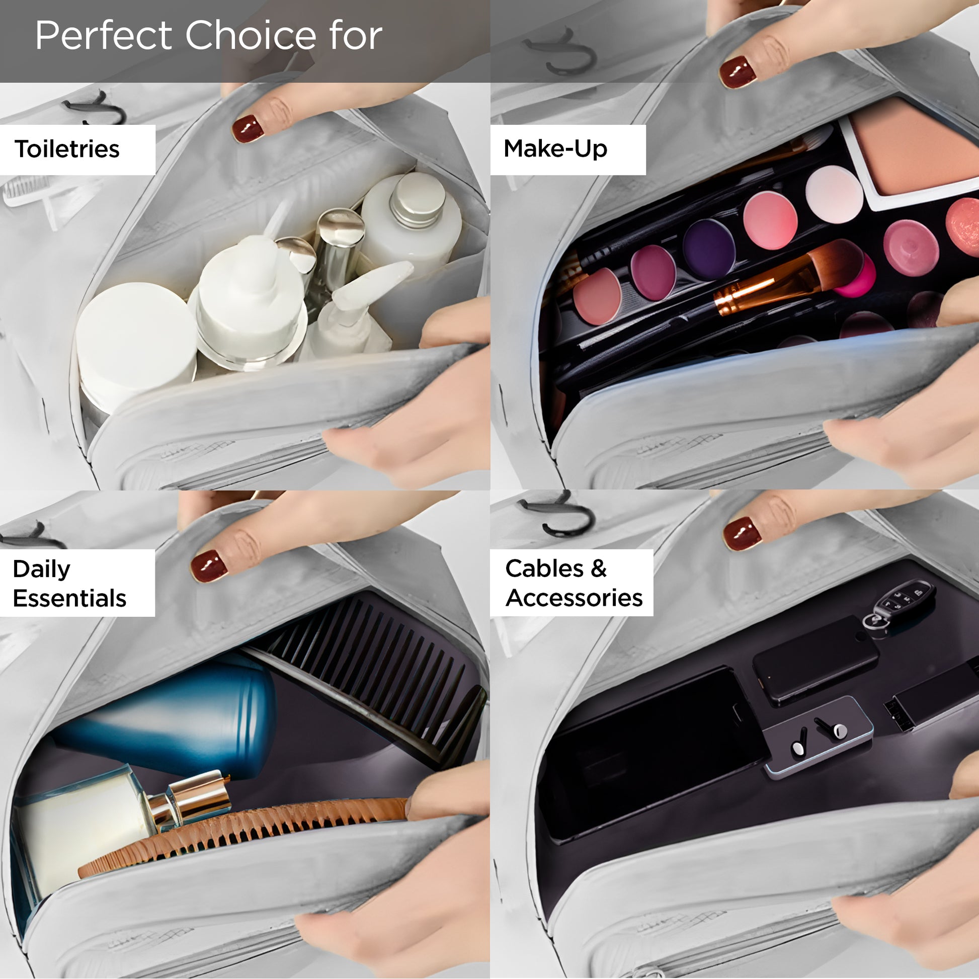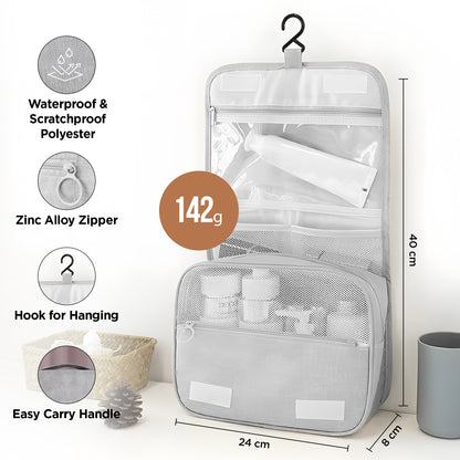 Space Saver Travel Organizer & Pouch | Toiletry Bag with Hook | Hanging Dopp Kit for Men & Cosmetics Pouch for Women | Open Bag 24 * 8 * 40cm | Waterproof | Grey