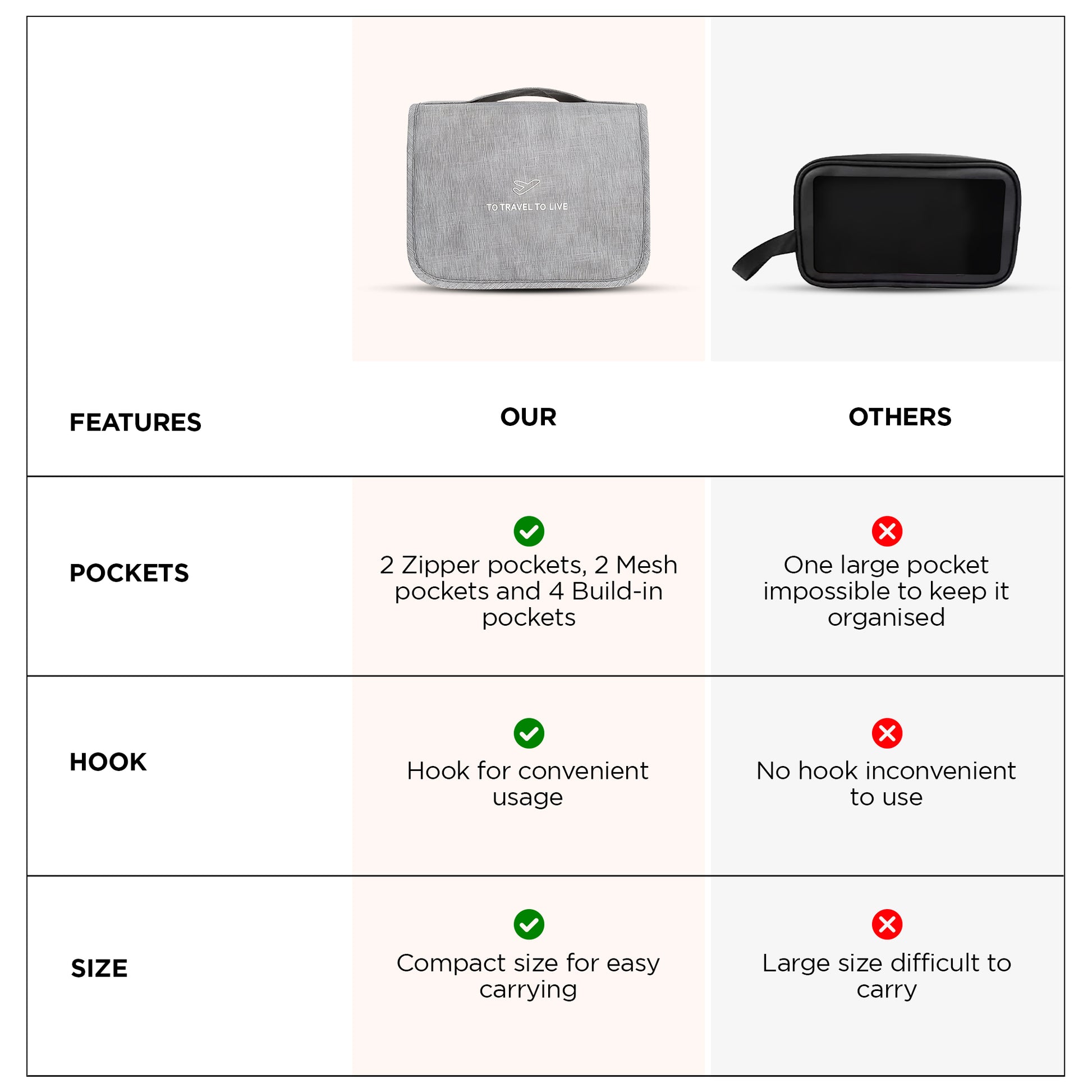 • Convenient Hanging Hook: The built-in hook allows you to hang the bag for easy access, making it perfect for hotel bathrooms or while camping.