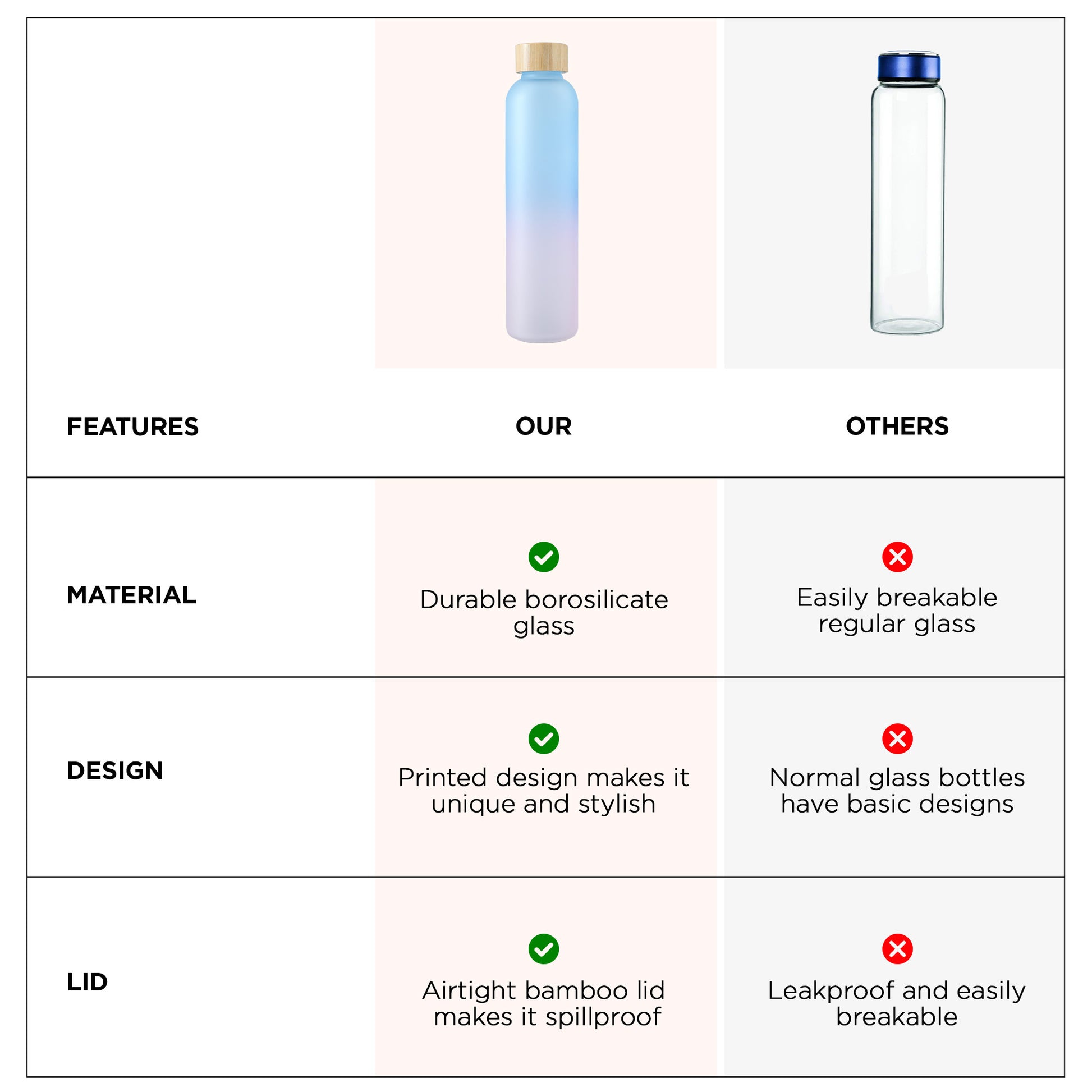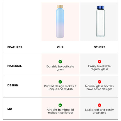 The UMAI Water Bottle is expertly crafted from borosilicate glass, ensuring durability and resistance to temperature changes. Its elegant gradient design in soothing blue and pink hues makes it a perfect accessory for home, office, or on-the-go.