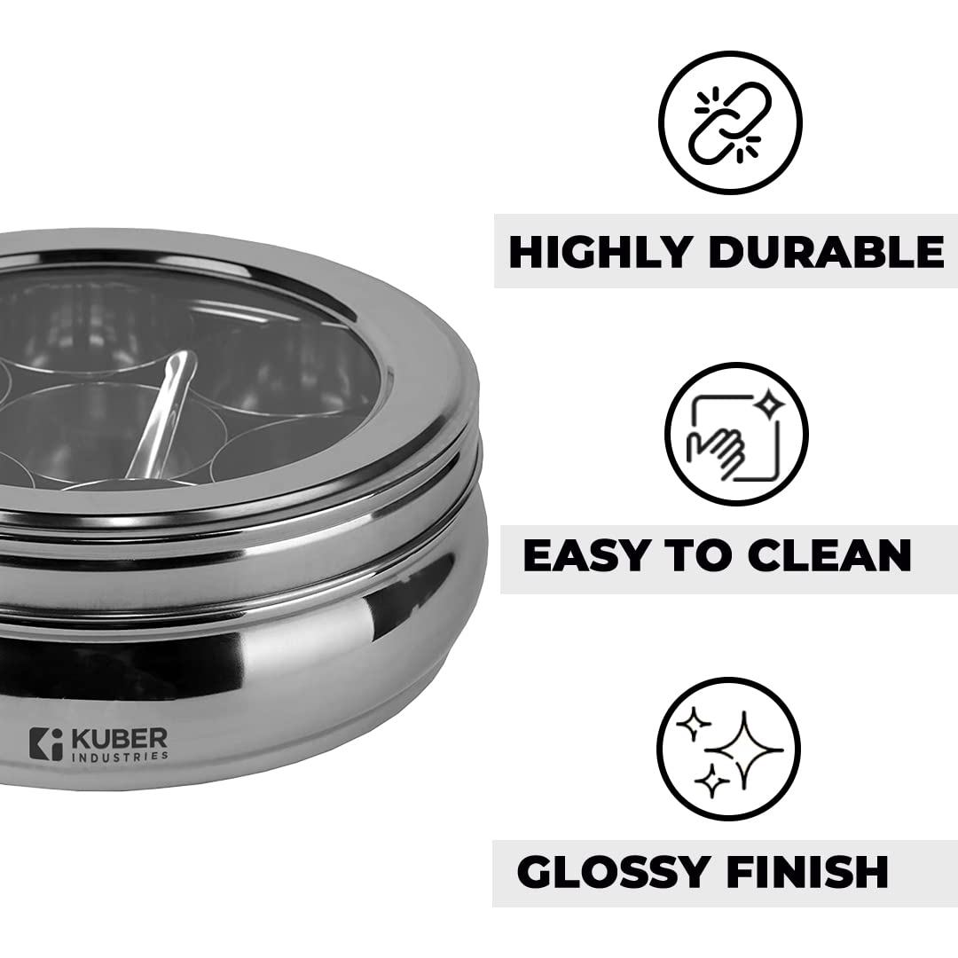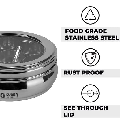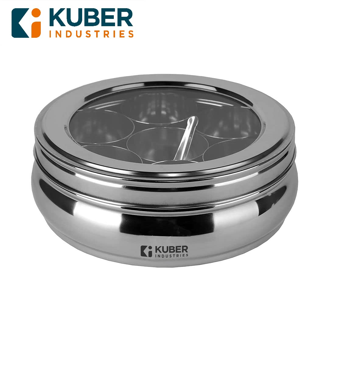 Kuber Industries 7 in 1 Stainless Steel Belly Shape Masala (Spice) Box I 7 Containers and Spoon I See Through Lid I Masala Daani/Dabba for Kitchen I Silver, Large (1250 ml)