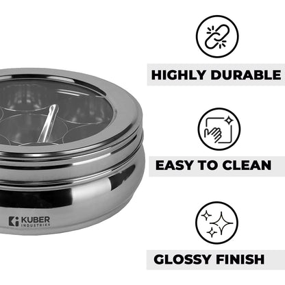 • Elegant Design: The glossy finish and smooth surface give this masala box a modern aesthetic that seamlessly blends with any kitchen décor.