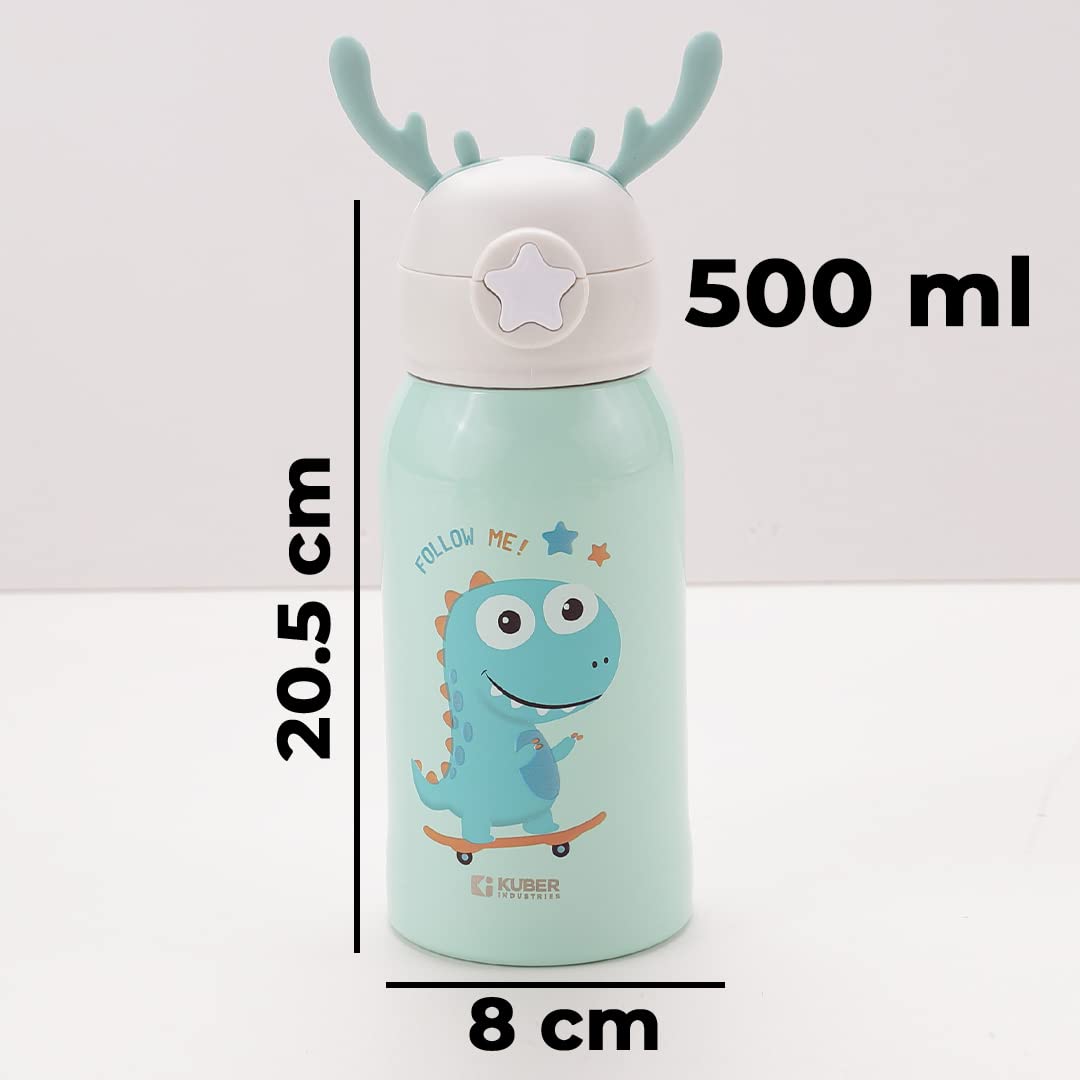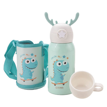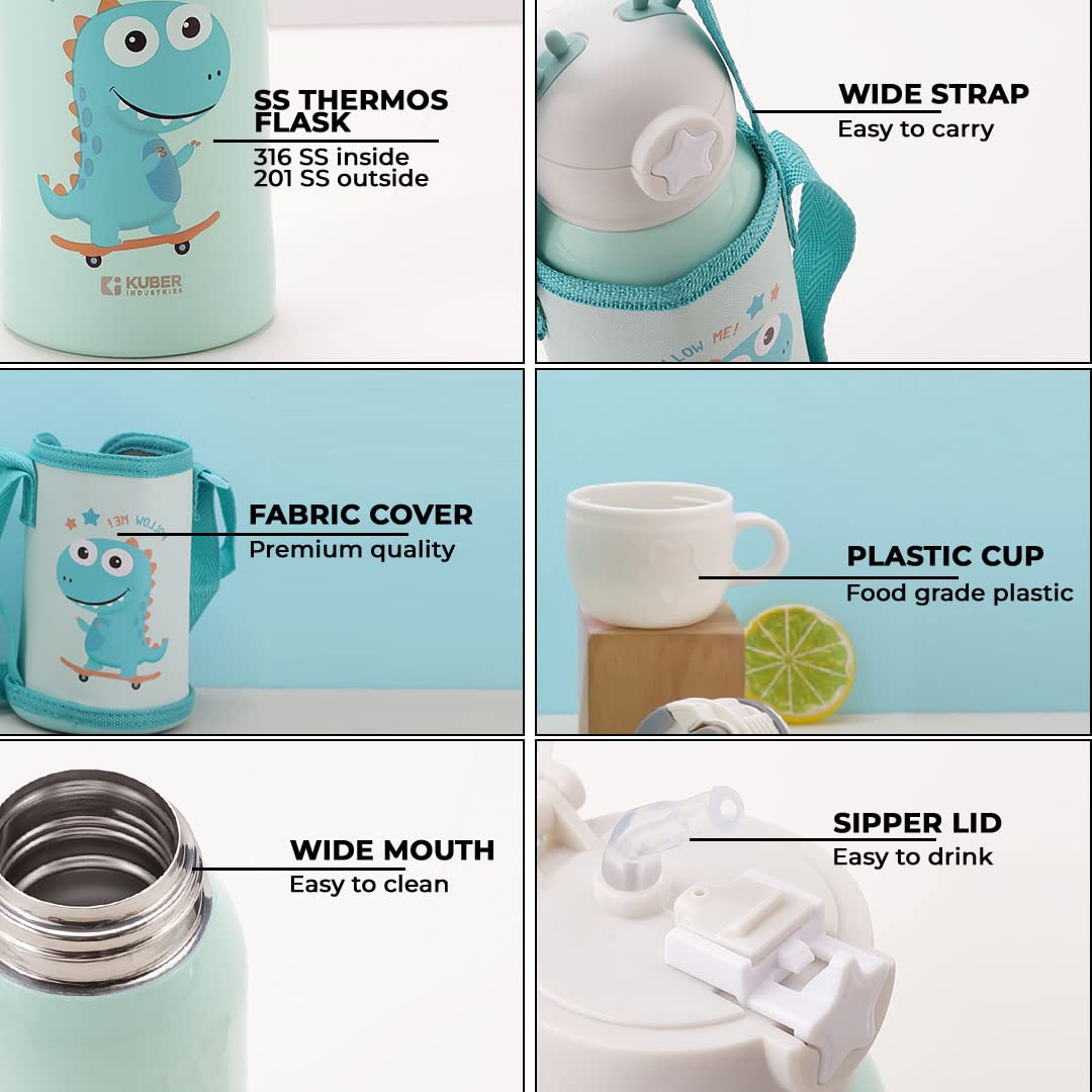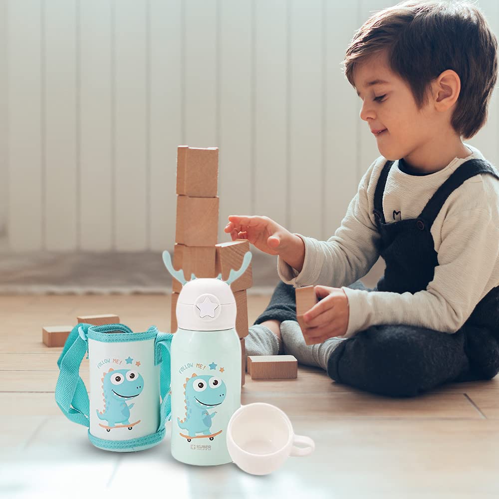 Urbane Home Water Bottle for Kids | Dino Design Stainless Steel Flask with Straw, Cup & Fabric Cover | Broad Fabric Strap | Leak Proof, BPA Free | 500 ml