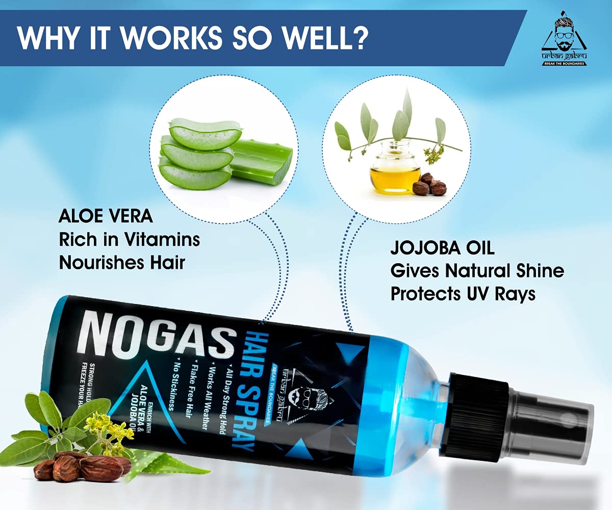 Introducing the UrbanGabru Unlimited Hold No Gas Hair Spray (100 ml), a revolutionary hair styling solution crafted by Urban Gabru. Encased in a stylish blue bottle, this hair spray is meticulously formulated with natural ingredients like Aloe Vera, Vitamin E, and Jojoba Oil, ensuring that your hair receives the best nourishment while looking fabulous. Perfect for all hair types, it is designed to give your hair an amazing hold for any occasion.