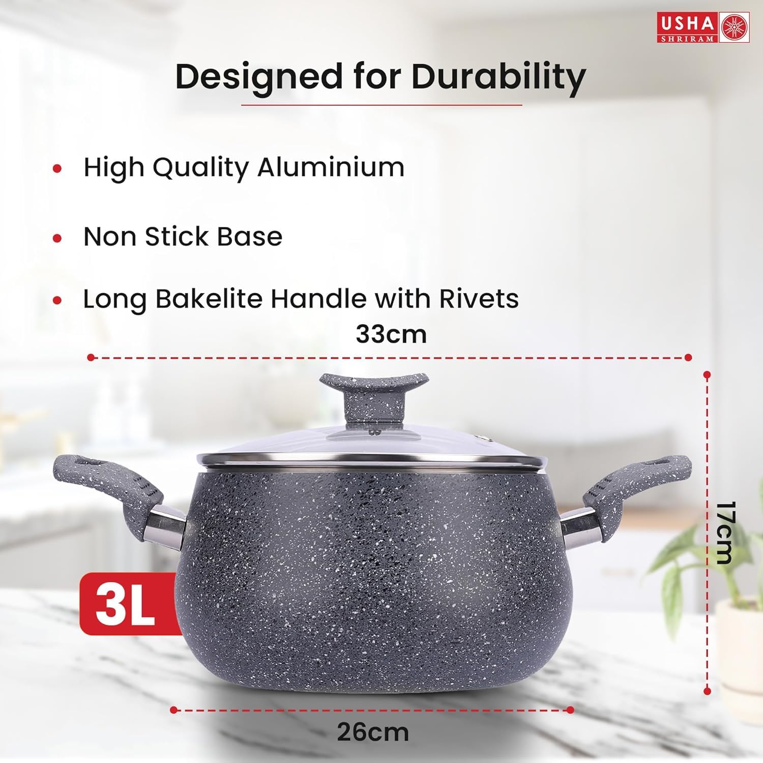 USHA SHRIRAM 3 pcs Pots and Pans Non Stick 3L Big Biryani Handi(with lid), 18cm Frying Pan,24cm Roti Tawa |Gas Stove, Non-Stick, Easy-Grip |Aluminium, Scratch-Resistant | Grey | Pack of 3