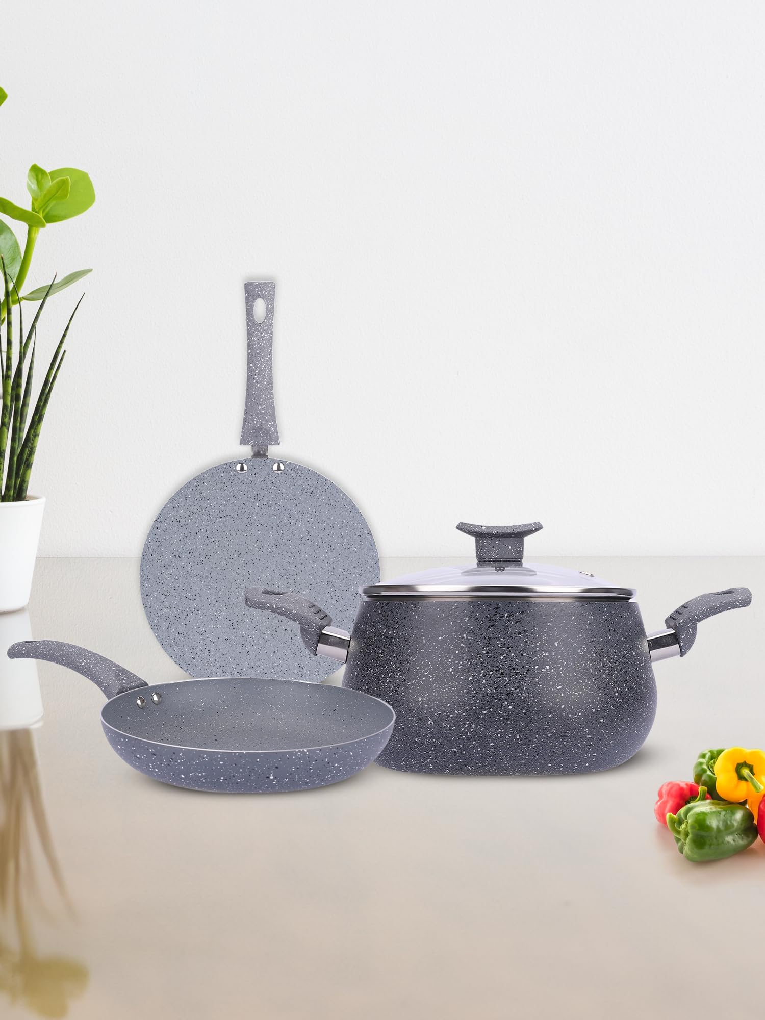 3 pcs Pots and Pans Non Stick 3L Big Biryani Handi(with lid), 18cm Frying Pan,24cm Roti Tawa |Gas Stove, Non-Stick, Easy-Grip |Aluminium, Scratch-Resistant | Grey | Pack of 3