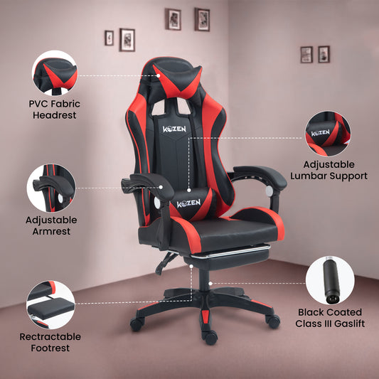 Gaming Chair with Retractable Padded Footrest, 135 Recliner Chair with Premium PVC Fabric, Ergonomic Chair, Computer Chair, Class 3 Gas Lift, Adjustable Headrest & Lumbar Cushion, Red, 1