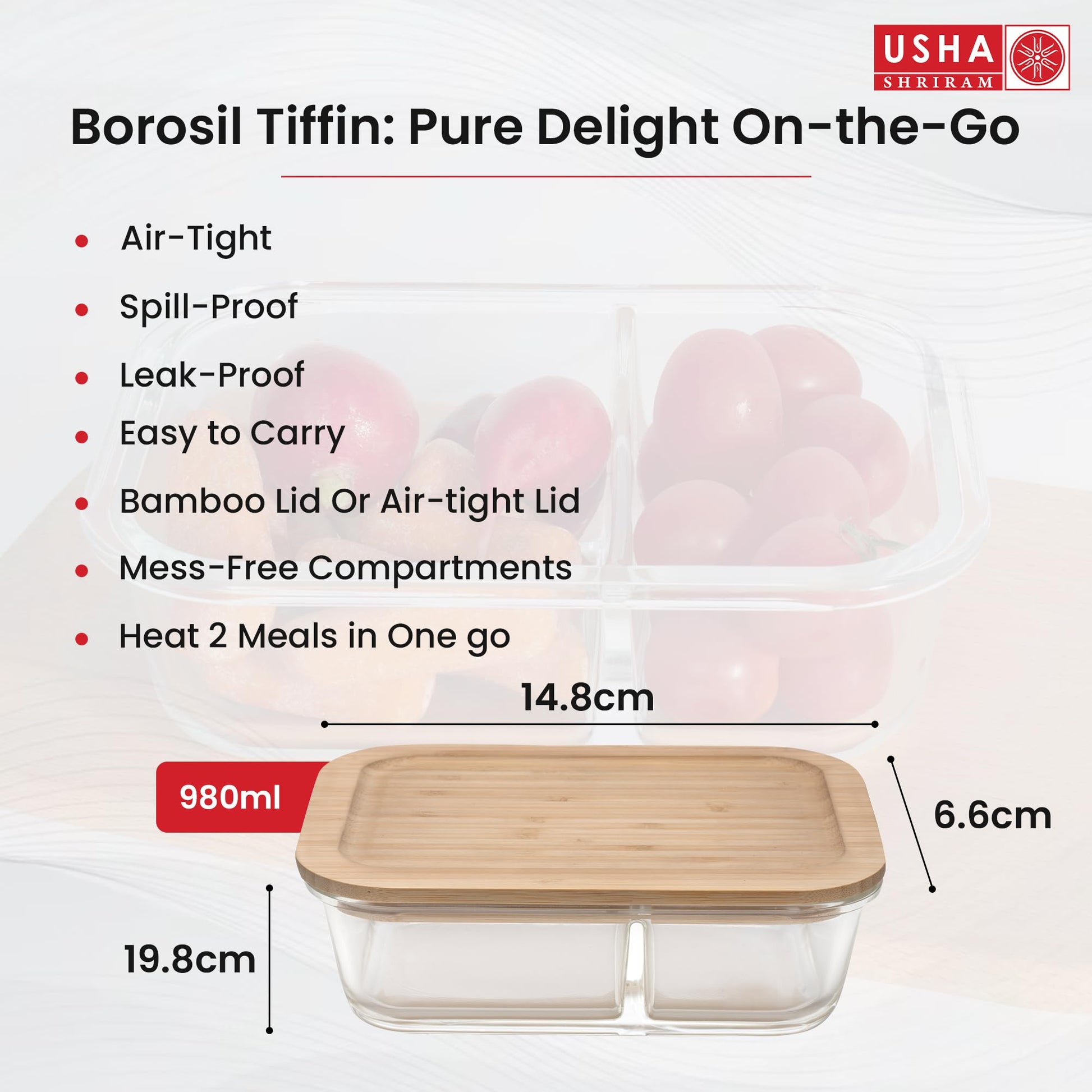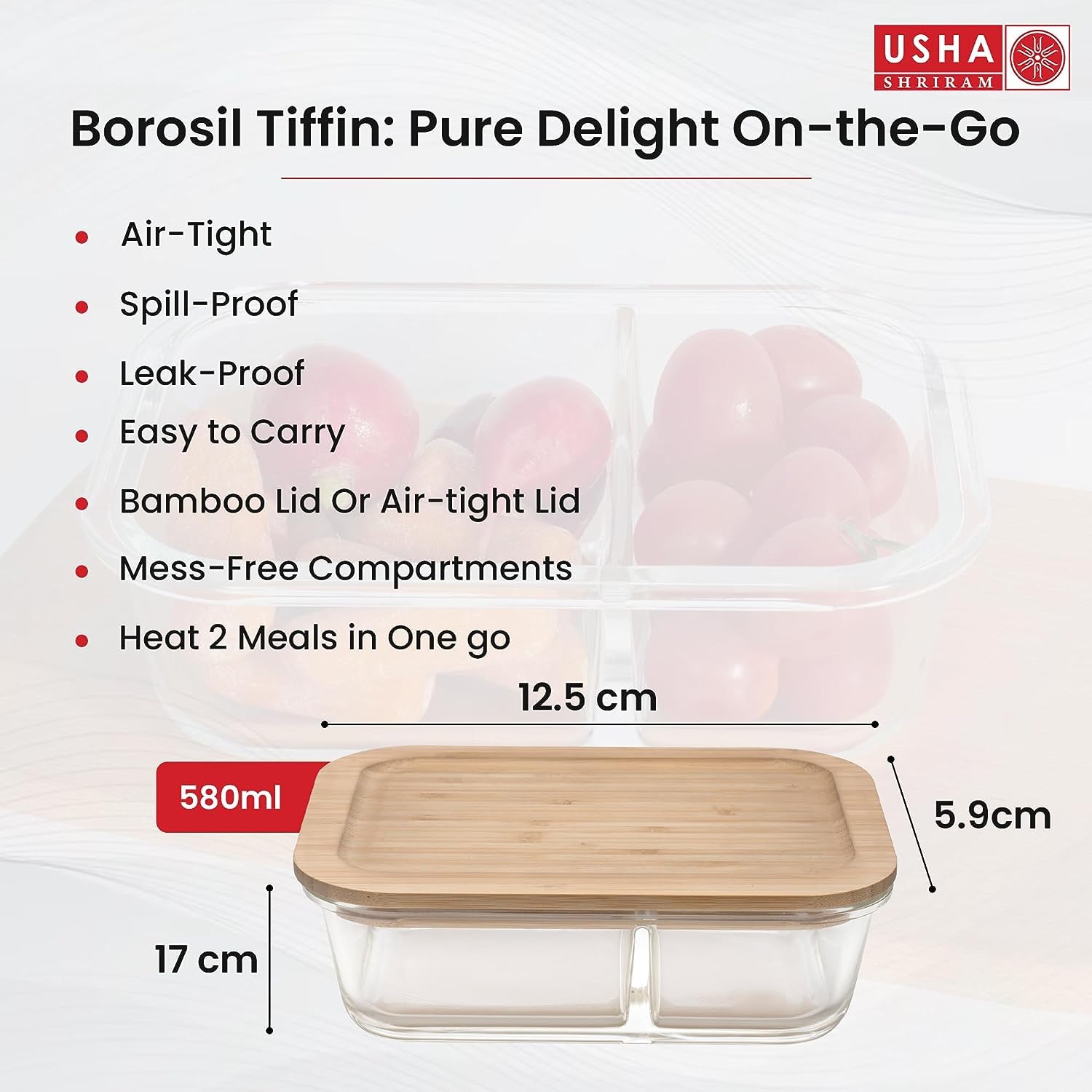 USHA SHRIRAM Borosilicate Tiffin Box| Tiffin Box for Office for Men Women| Leak-Proof Lunch Box | Borosilicate Lunch Box with Wooden Lid | (Set of 2 : Small 580ml+ Large 980ml)