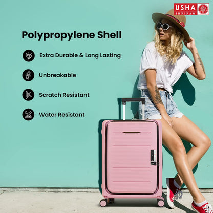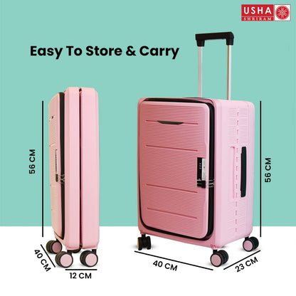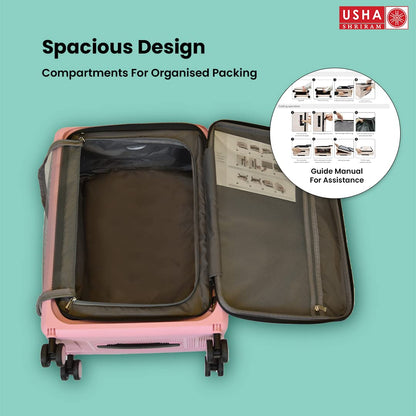 Travel in style and convenience with the USHA SHRIRAM Cabin & Check-In Bag Combo, featuring two sizes (55cm and 65cm) designed for all your travel needs. This set offers a perfect blend of functionality and aesthetic appeal, adorned in a chic rose pink that stands out while remaining practical.