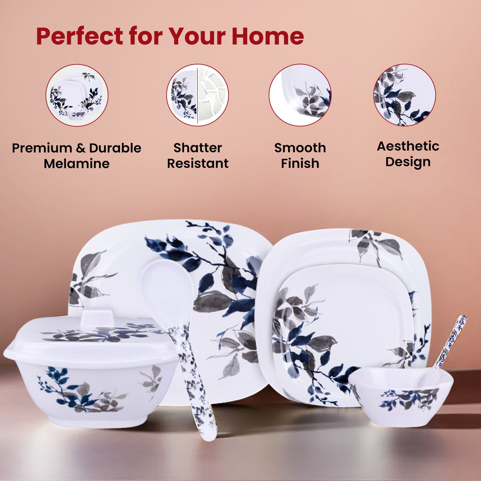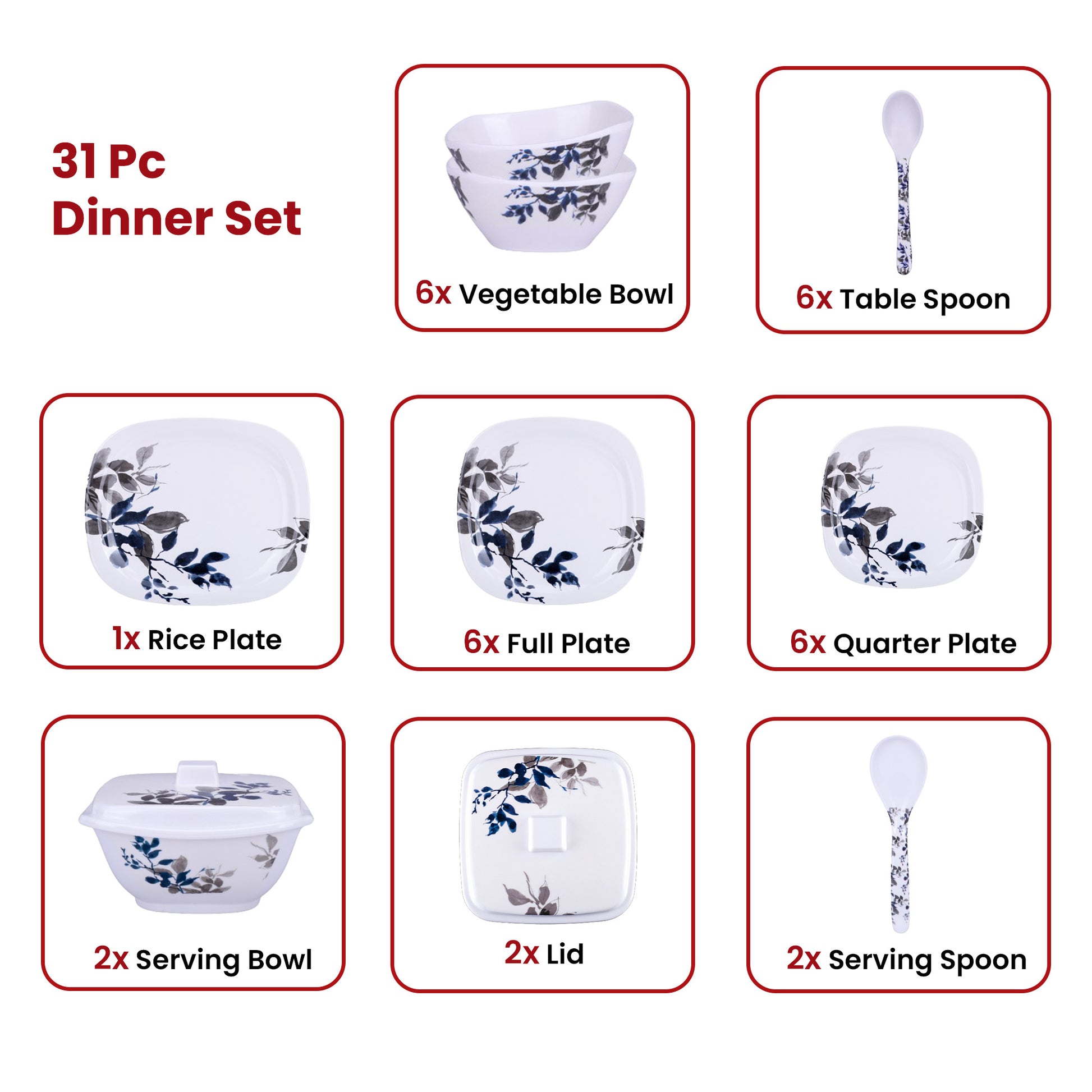 USHA SHRIRAM Melamine Dinner Set (31 Pcs) | Kitchen Set for Home | Unbreakable Plates and Bowls Set | Dinner Ware Set | Dinner Ware Set | Fiber Dinner Set | Gift for Marriage (Blue Bail)