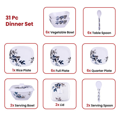 Elevate your mealtime with the USHA SHRIRAM Melamine Dinner Set, a comprehensive collection that includes 31 pieces of beautifully designed dinnerware. Perfect for both everyday use and special occasions, this set combines functionality with style, making it an ideal addition to any kitchen.