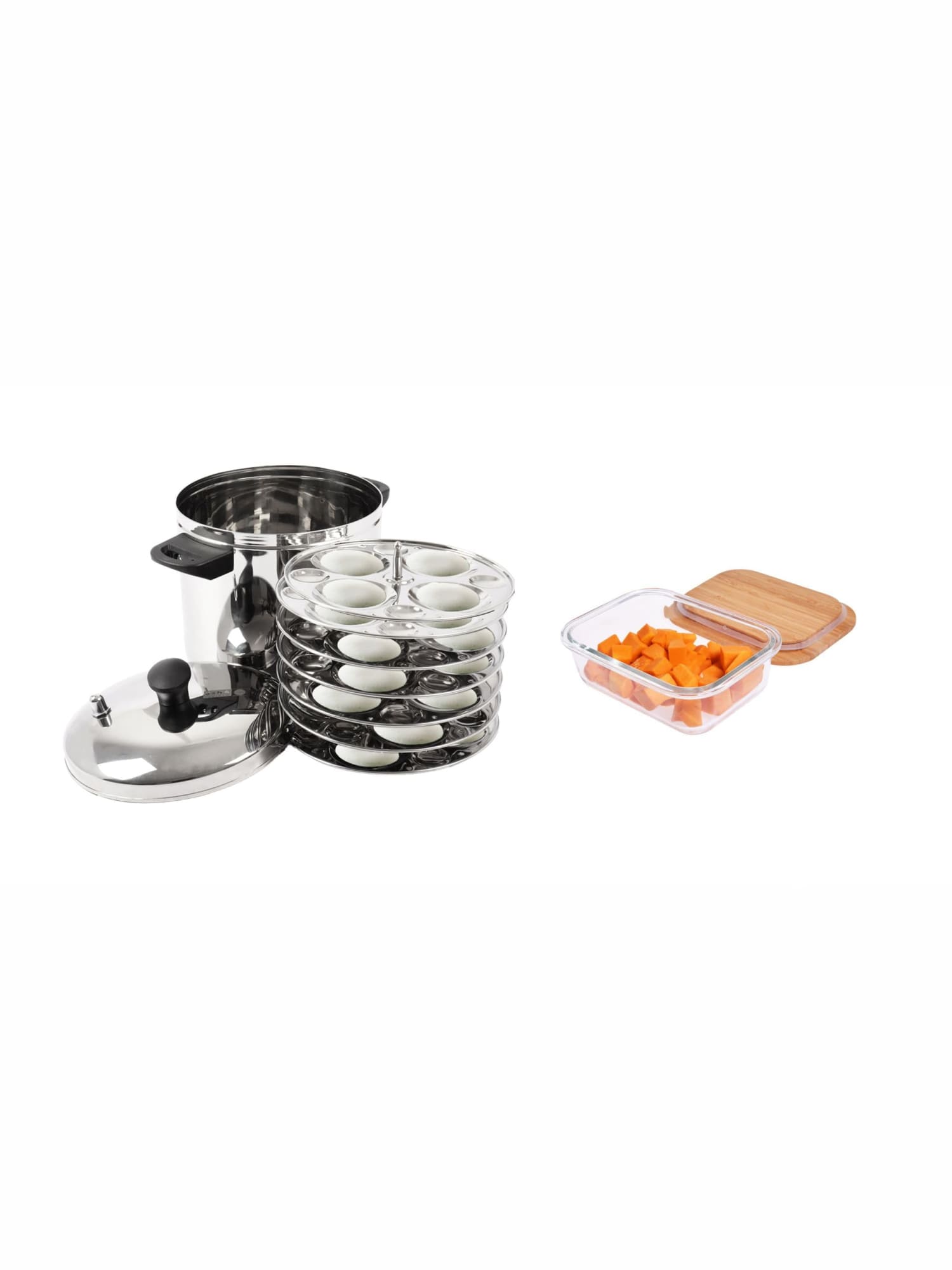 Stainless Steel Idli Cooker | Induction & Gas Friendly Base | Idly Maker | Idli Stand | Thate Idli Maker | Idly Cooker (Idli steamer (6 Plate) +1.05L Container)