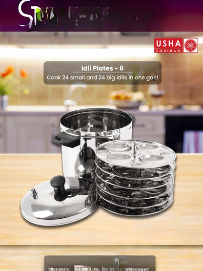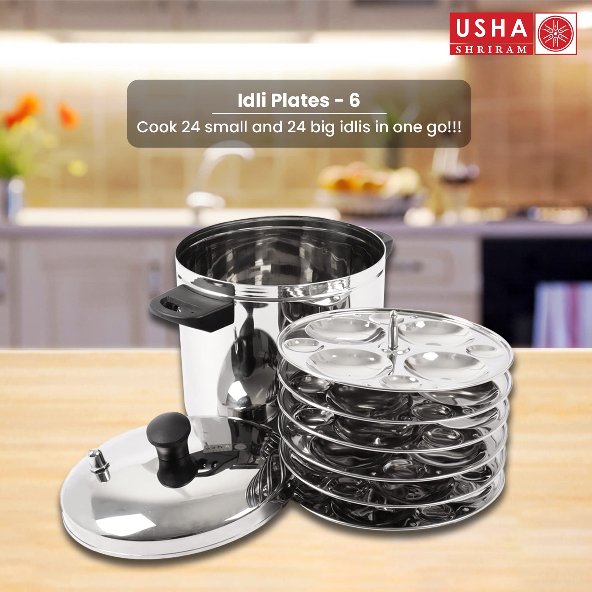 USHA SHRIRAM Stainless Steel Idli Cooker | Induction & Gas Friendly Base | Idly Maker | Idli Stand | Thate Idli Maker | Idly Cooker (Idli steamer (6 Plate) +1.05L Container)