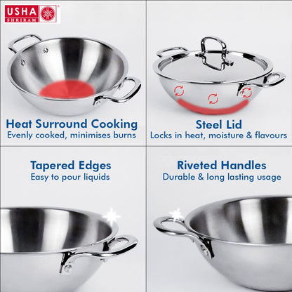 USHA SHRIRAM Triply Stainless Steel Kadai with Lid (3.5L) & Non Stick Kadai with Lid (4.4L) | Stove & Induction Cookware | Heat Surround Cooking | Heavy Bottom Kadai | Deep Frying Kadhai