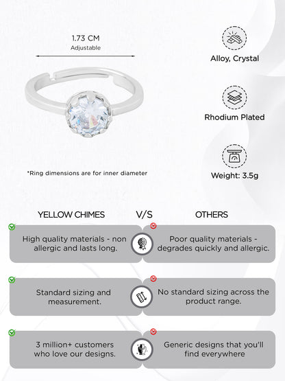 Introducing the Adjustable Crystal Silver Ring by Yellow Chimes, your perfect accessory for any occasion. This stunning ring features a unique adjustable design with a crystal that sparkles brightly, making it an ideal choice for birthdays, anniversaries, or a treat for yourself. With a diameter of 1.74 CM and width of 0.7 CM, this elegant piece is made from high-quality rhodium-plated alloy, ensuring durability and style for everyday wear.