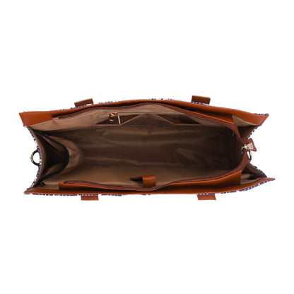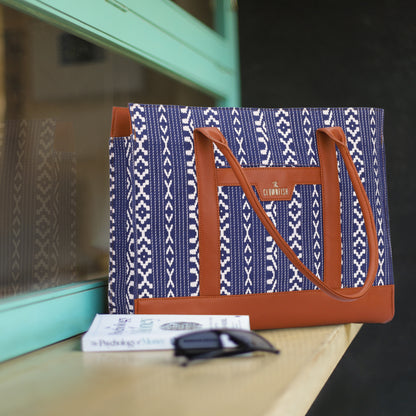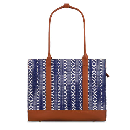 Introducing the Women's Laptop Handbag by Clownfish, a perfect blend of style and utility designed for the modern professional. Crafted from high-quality Printed Canvas + Vegan Leather in a classic Navy Blue color, this tote boasts a spacious 17 liters capacity. It features a dedicated 15.6-inch Laptop Sleeve to keep your device safe and secure, making it ideal for office use, travel, or attending conferences.