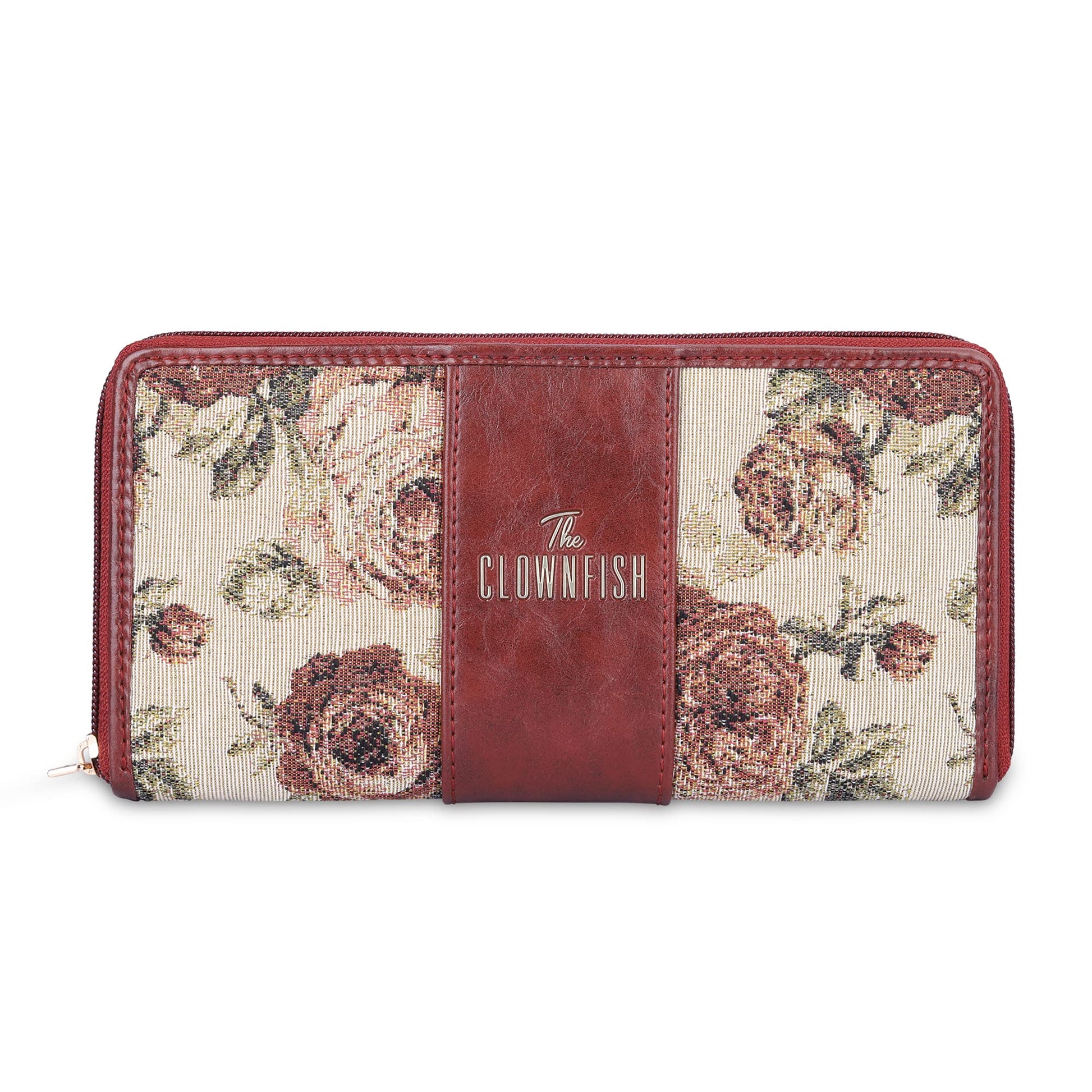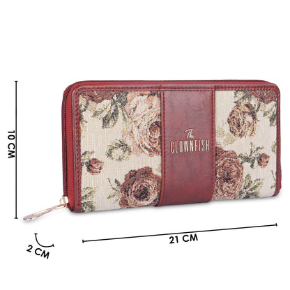 Introducing the Aria Collection Tapestry Fabric & Faux Leather Zip Around Style Womens Wallet by Clownfish, a stunning clutch designed for elegance and practicality. This wallet, crafted from premium tapestry fabric, features a slim design that is both stylish and convenient for everyday use. With dimensions of 21 cms x 2 cms x 10 cms and weighing only 0.14 kg, it is lightweight and easy to carry. The wallet's two cash compartments and zip pocket in between are perfect for organizing your essentials like cash, coins, passport, and tickets. The multiple card slots allow for easy access to your credit and debit cards, ensuring that you stay organized on the go.