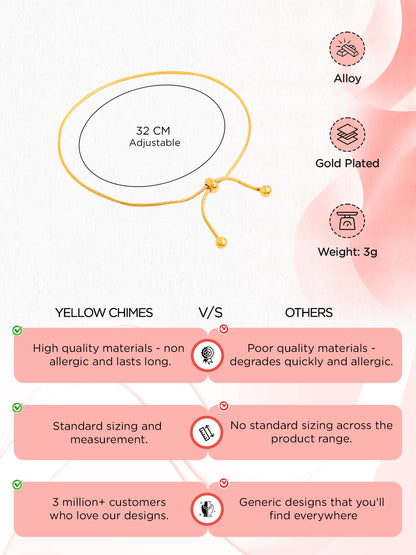 Yellow Chimes Anklet for Women | Fashion Gold Adjustable Anklets for Women | Simple Chain Anklet for Girls | Golden Leg Chain for Girls | Birthday Gift for Women Anniversary Gift for Wife BUILT TO LAST: Designed for durability, this anklet withstands daily wear without fading or breaking, ensuring long-lasting elegance you can trust. Crafted with premium materials, our anklet offers stunning beauty that lasts, without sacrificing quality or longevity. VERSATILE STYLE : Enjoy a beautifully crafted anklet at an affordable price an invaluable addition to your jewelry collection! perfect for gifting, this stylish anklet delights kids, daughters, or friends on any occasion, enhancing any attire beautifully. Size Details: Circumference 32 CM. Weight is 3 gr. Material is Gold Plated and Metal is Alloy. Packaging: Your favorite piece of Jewellery will reach you in an Elegant Yellow Chimes box with safety and precautions. You can leave it to us the job of delivering your Jewellery in original condition to you at your door-step. ELEGANT DESIGN: This stunning gold anklet features exquisite gold plating on lightweight alloy, ensuring a perfect fit for everyone with its chic One Size design. Elevate any outfit effortlessly! This chic anklet is perfect for casual outings or formal events, offering impressive durability and cuteness.