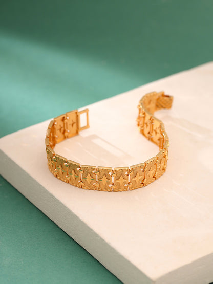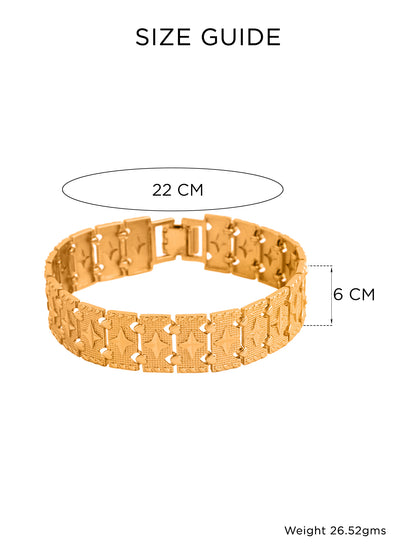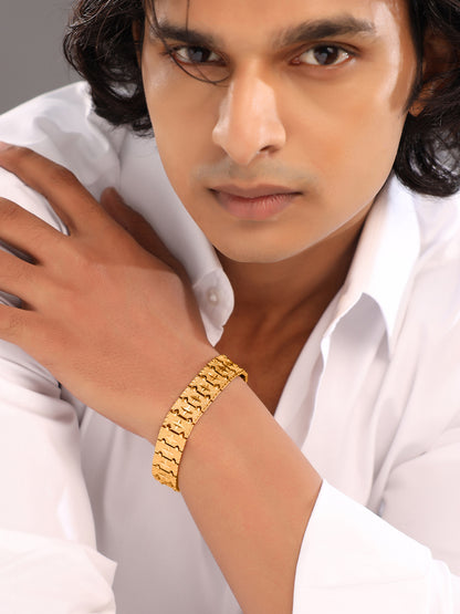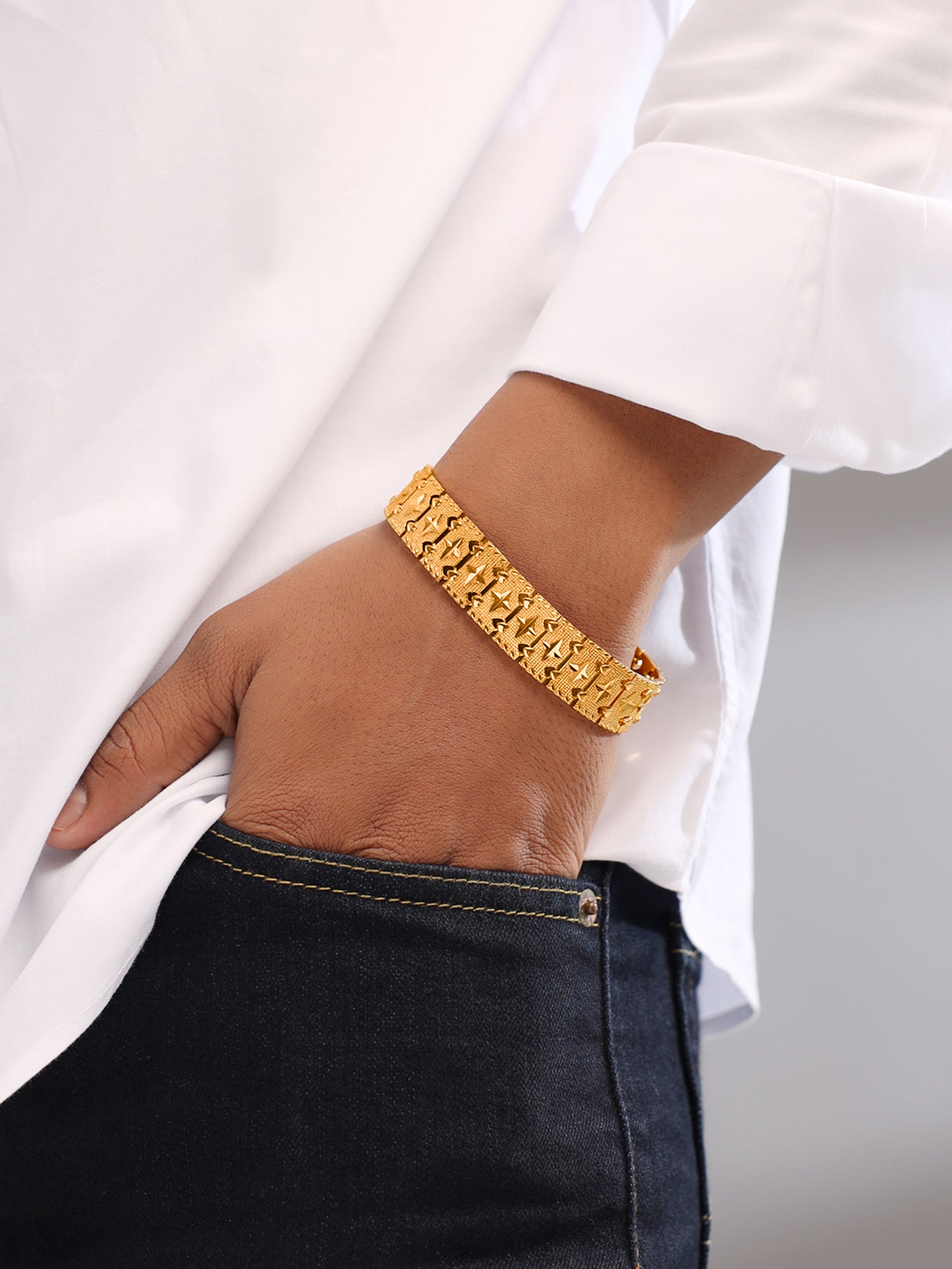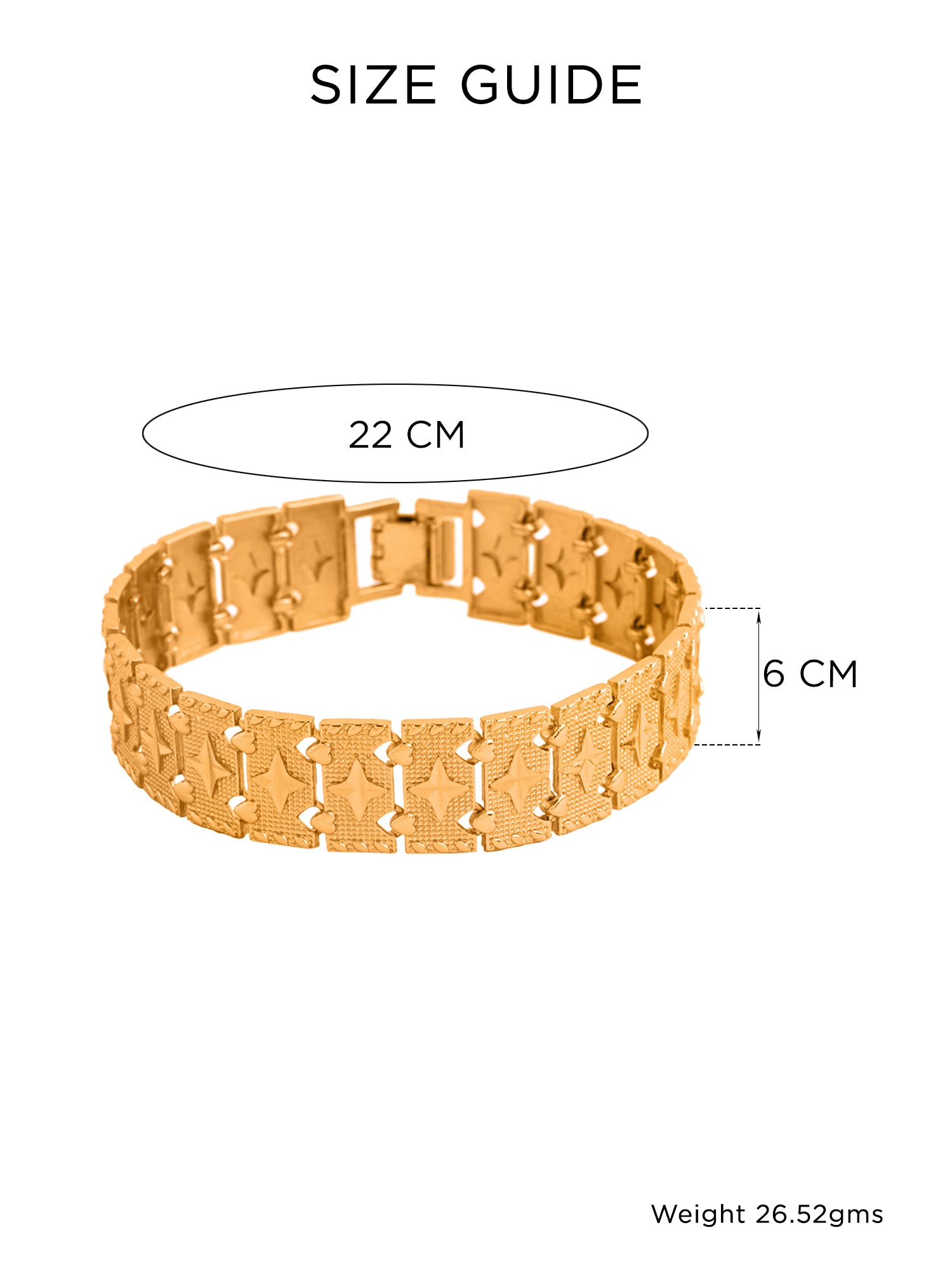 Yellow Chimes Bracelet For Men| Fashion Golden Bracelet For Women Hand Accessories For Men | Broad Chain Bracelets for Boys| Birthday Gift for Men Anniversary Gift for Husband VERSATILE ACCESSORY: Ideal for any occasion, this bracelet enhances your style, providing quality and designs that effortlessly suit your wardrobe needs. Gift this stunning bracelet for special moments—perfect for brothers, friends, or husbands on occasions like Rakhi or birthdays. STYLE WITHOUT COMPROMISE: This bracelet combines elegance with secure locking, delivering both a chic aesthetic and reliable functionality effortlessly. Crafted with materials, this bracelet is built to last, ensuring it remains a cherished staple in your collection for years. SIZE DETAILS : Length - 22CM, Width is 1.5CM. Weight is 26.52gr. Material is Gold Plated and Metal is Brass. PACKAGING : Your favorite piece of Jewellery will reach you in an Elegant Yellow Chimes box with safety and precautions. You can leave it to us the job of delivering your Jewellery in original condition to you at your door-step. ELEGANT DESIGN: This gold-plated brass Yellow Chimes bracelet elevates any outfit with its stylish, versatile one-size fit, adding sophistication to your jewelry collection. Enjoy all-day comfort with its fully polished finish and secure fold-over clasp, blending luxury with functionality for a perfect accessory.
