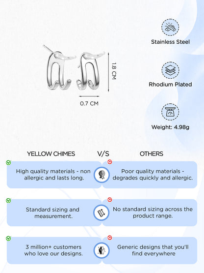 Yellow Chimes Stud Earrings for Men | Fashion Stainless Steel Silver Studs Men's Earring | Accessories for Men | Birthday Gift for Boys & Men Anniversary Gift for Husband ELEGANT DESIGN: Featuring a gorgeous silver finish and sleek stud style, these earrings effortlessly enhance any outfit. Designed for universal fit, these earrings blend style and comfort seamlessly. VERSATILE OCCASION: Ideal for nights out or formal events, these earrings instantly add sophistication to any look. A thoughtful present for brothers, boyfriends, or friends ideal for birthdays, anniversaries, or Valentineâ€s Day. SIZE DETAILS: Earring Length is 1.8 CM * Width is 0.7 CM. Weight is 4.98 gr. Metal is Stainless Steel, Closure is Push back. PACKAGING: Your favorite piece of Jewellery will reach you in an Elegant Yellow Chimes box with safety and precautions. You can leave it to us the job of delivering your Jewellery in original condition to you at your door-step. MATERIAL: Made from durable stainless steel, these lightweight earrings ensure stylish comfort all day long. Enjoy exceptional quality and design with these stylish earrings.