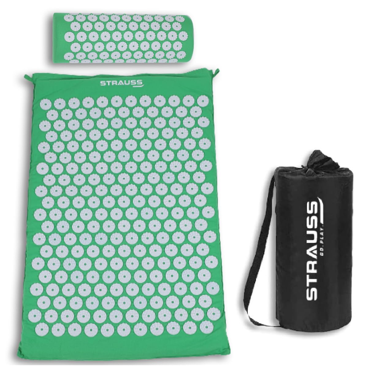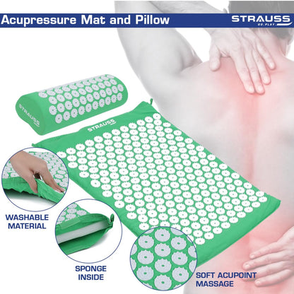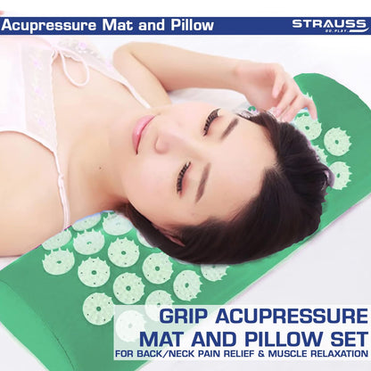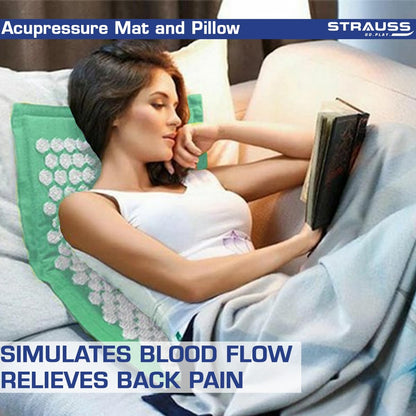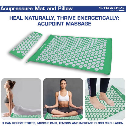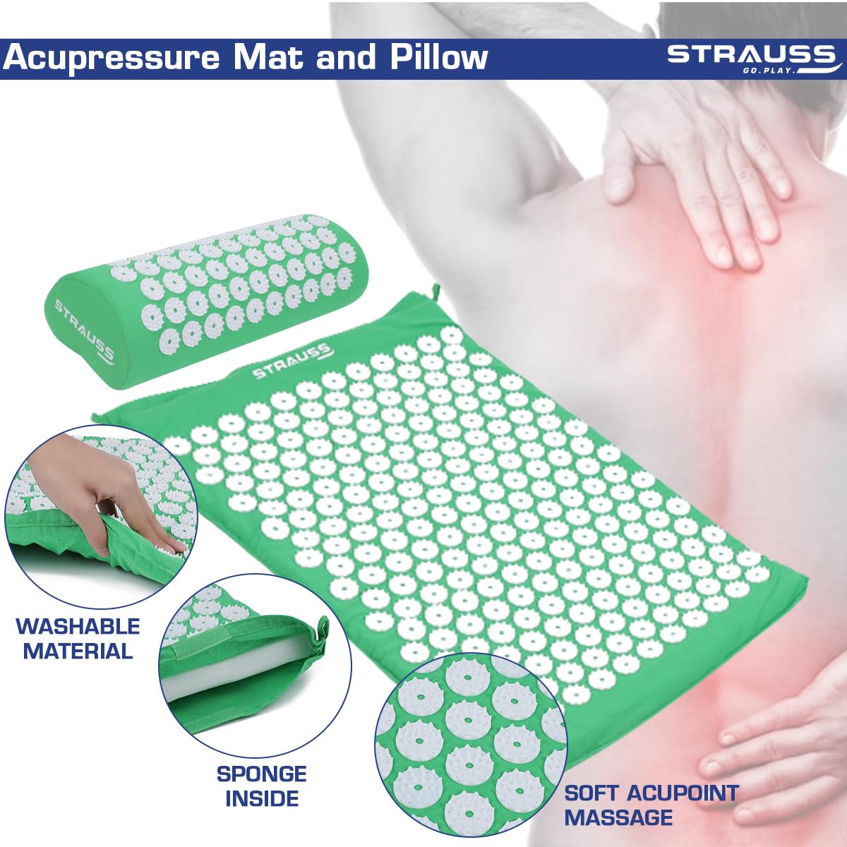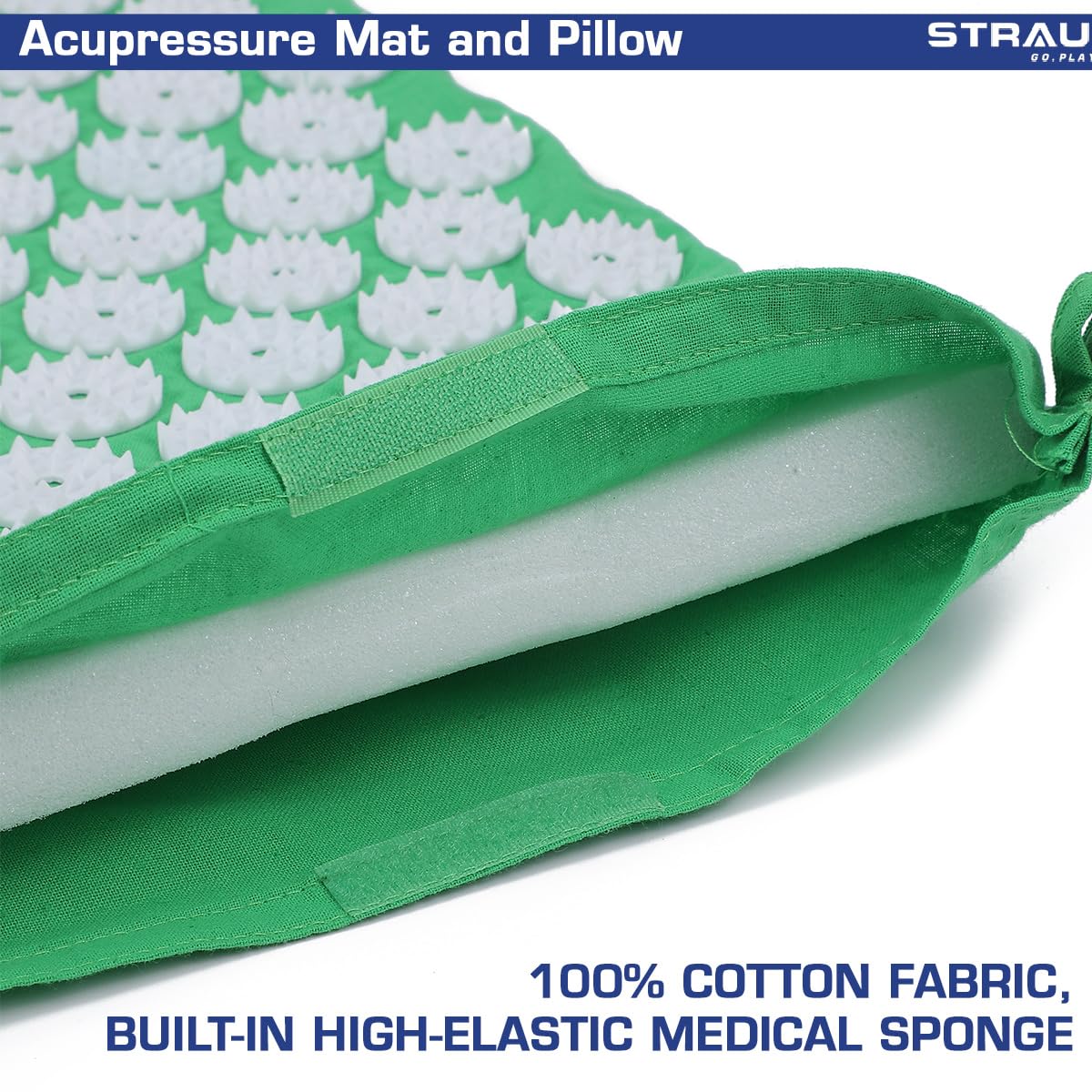 STRAUSS Pain Relief Acupressure Exercise Mat with Pillow | Yoga Acupuncture Mat Trigger Point Therapy, Muscle Relaxation, Cures Sciatica and Blood Circulation | 68 X 42 X 2 CM,(Green)