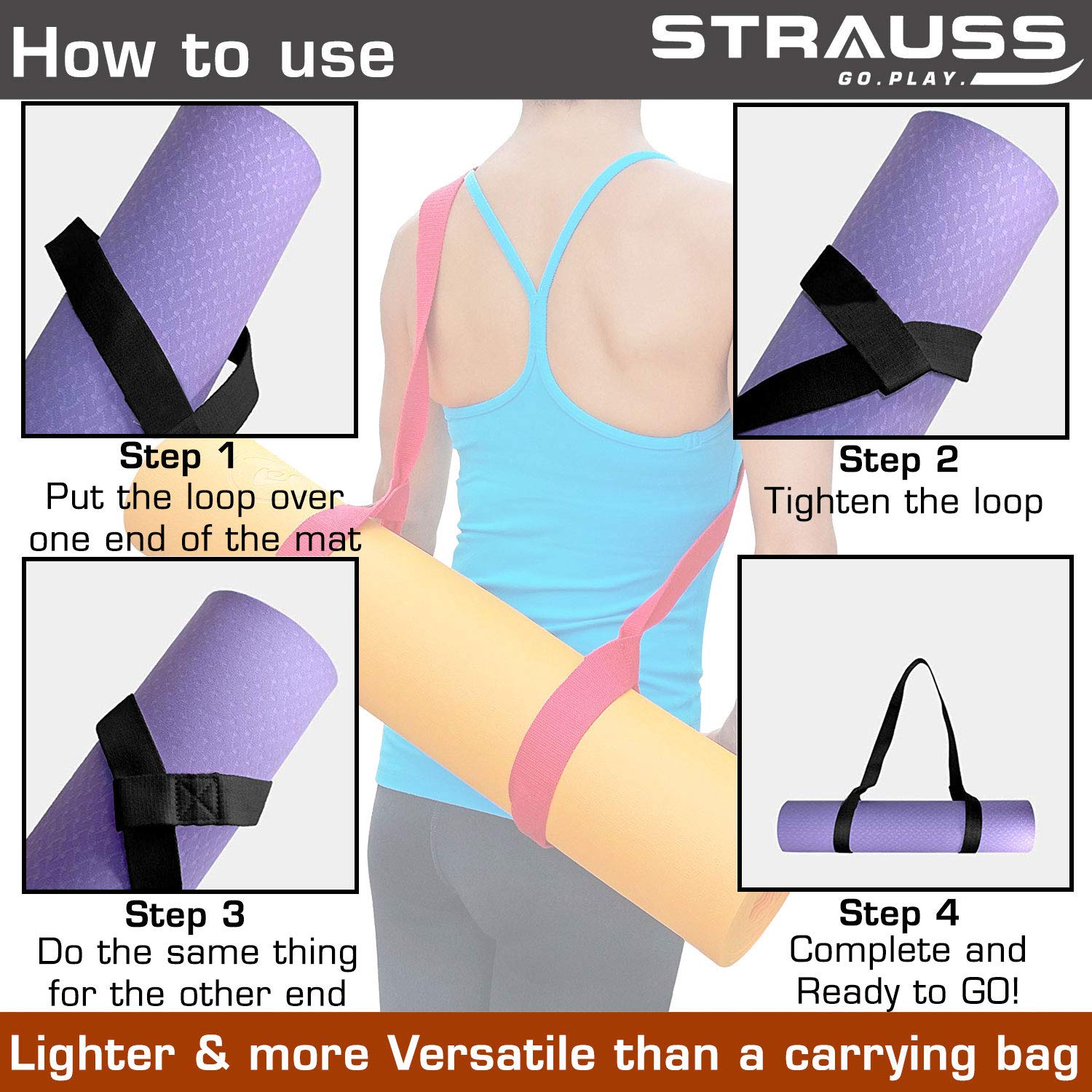 Perfect for daily use, the Strauss Yoga Mat Strap can be taken along for different activities including: