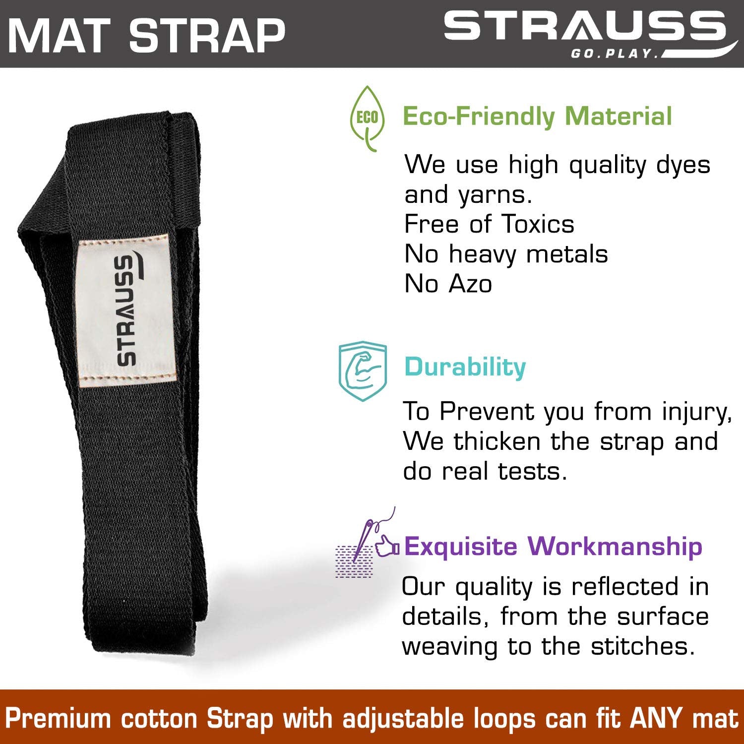 STRAUSS Adjustable Yoga Mat Strap | Durable Cotton Sling for Carrying & Holding Mat | Comfy, Thick, Suitable for Mats Up to 15mm | Black