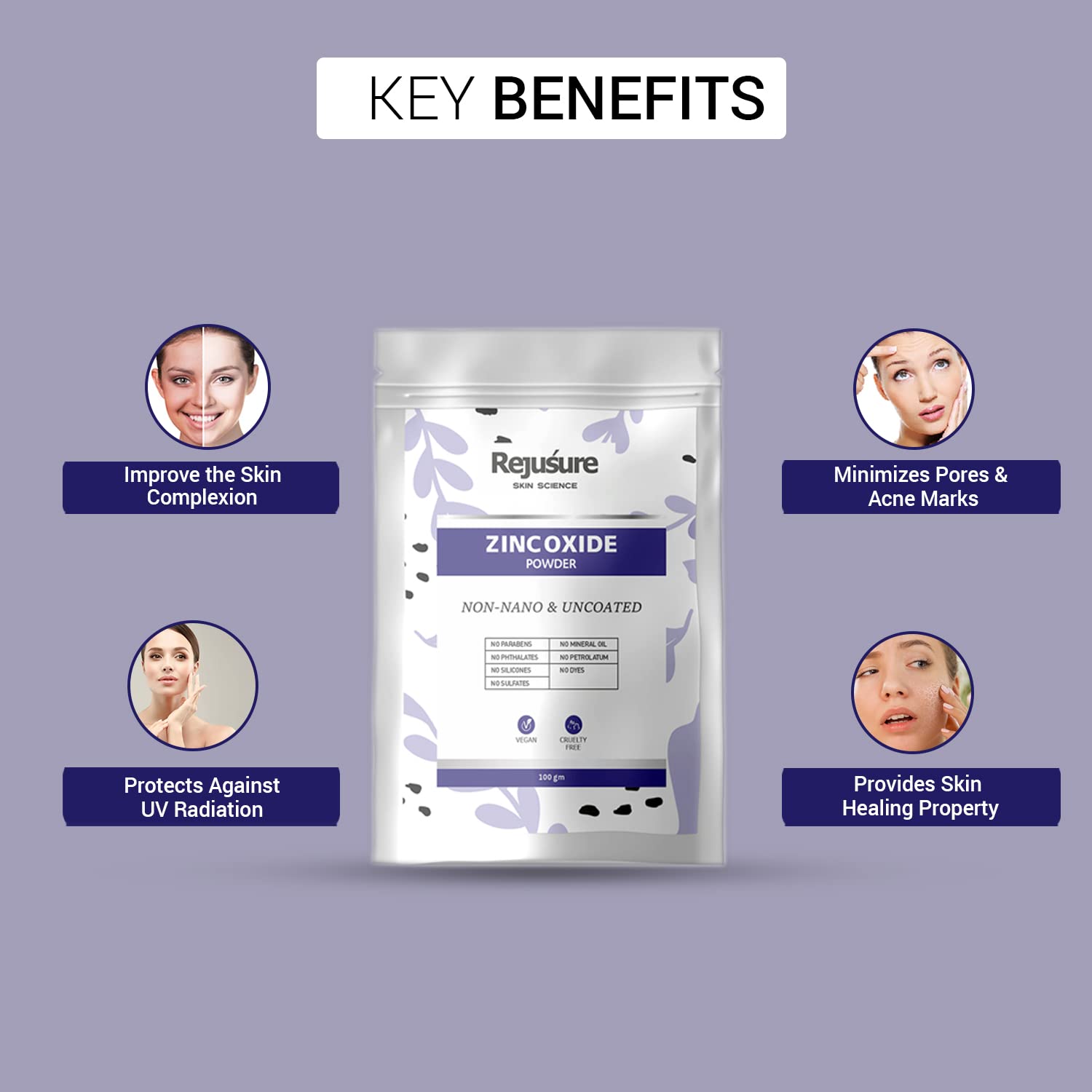 Perfect for all ages and skin types, including people with specific skin concerns needing extra care. Experience the rejuvenating benefits of Rejusure Zinc Oxide Powder Face Pack and unlock the secret to healthier, more radiant skin!