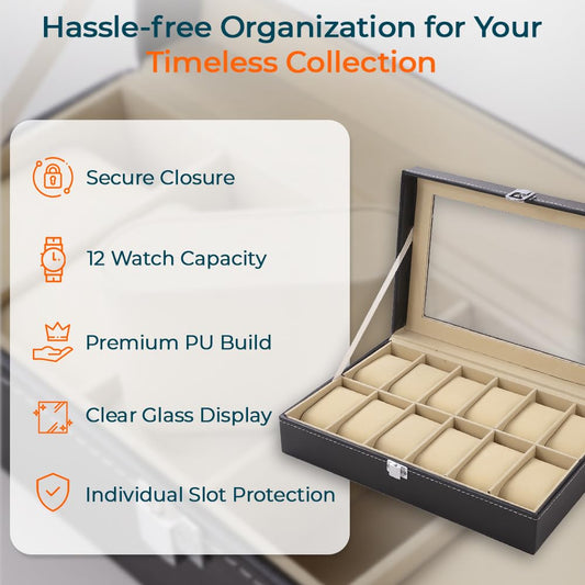 Kuber Industries 12 Slots Watch Organizer|Watch Storage Box For Men & Women|Secure Closer|Wrist Watch Display BoxBlack|