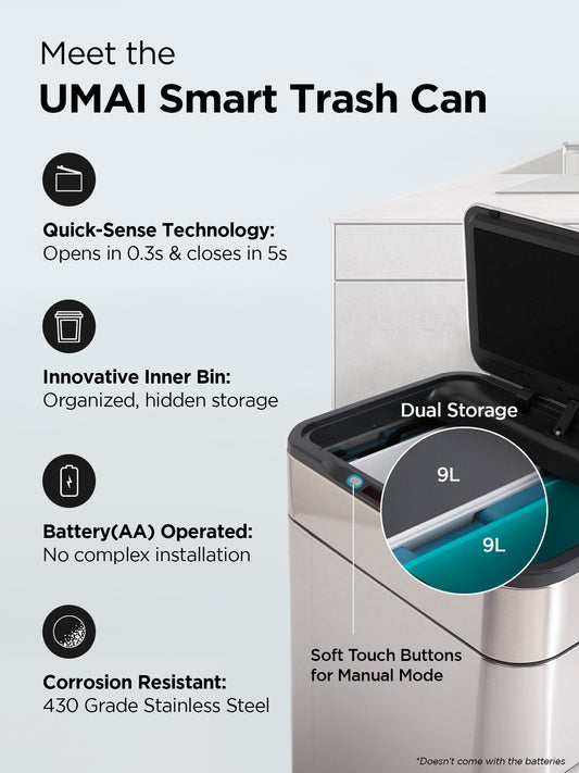 Stainless Steel Sensor Dual Compartment 18L Dustbin - Smart, Touchless | Lid Included | 40cm x 27cm x 38cm | Steel