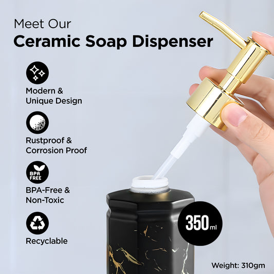 Liquid Soap Dispenser | Stoneware | Bathroom Sanitizer, Lotion, Shampoo Dispenser | Ceramic Handwash Bottle for Kitchen | Soap Dispenser for Wash Basin | Bathroom Accessories | 350 ml (Black)