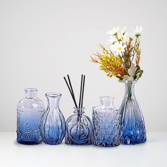 Set of 5: Crystal Clear Glass Bud Vases for Home Decoration | Standard | Blue